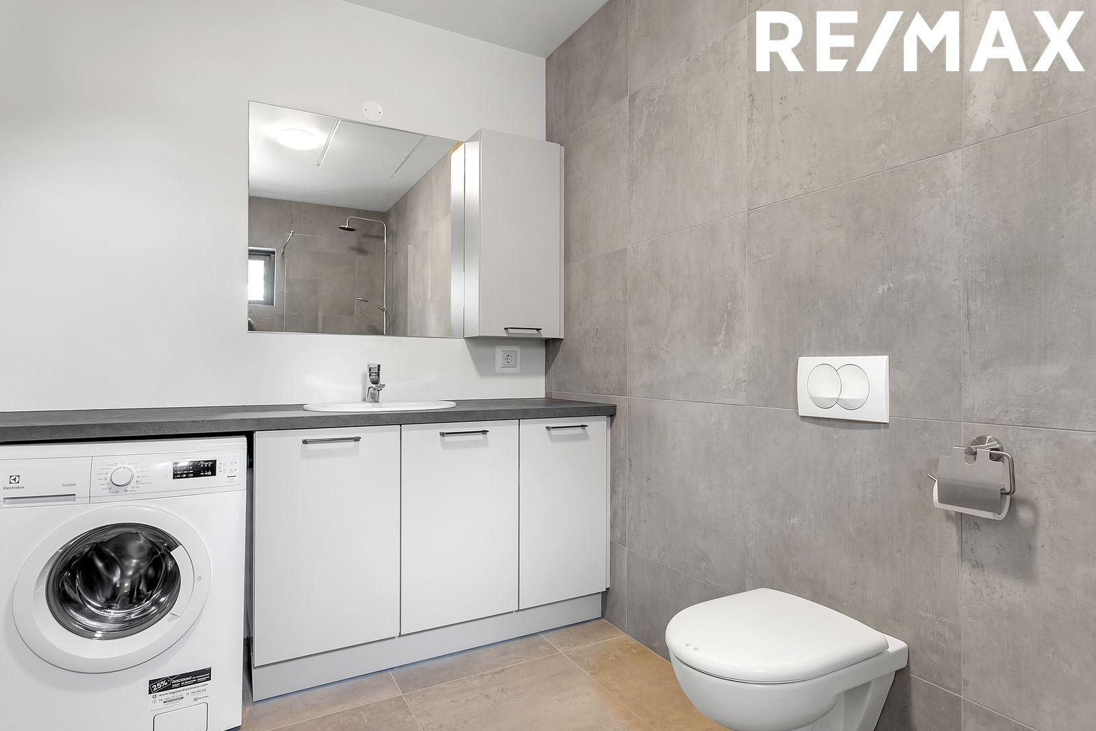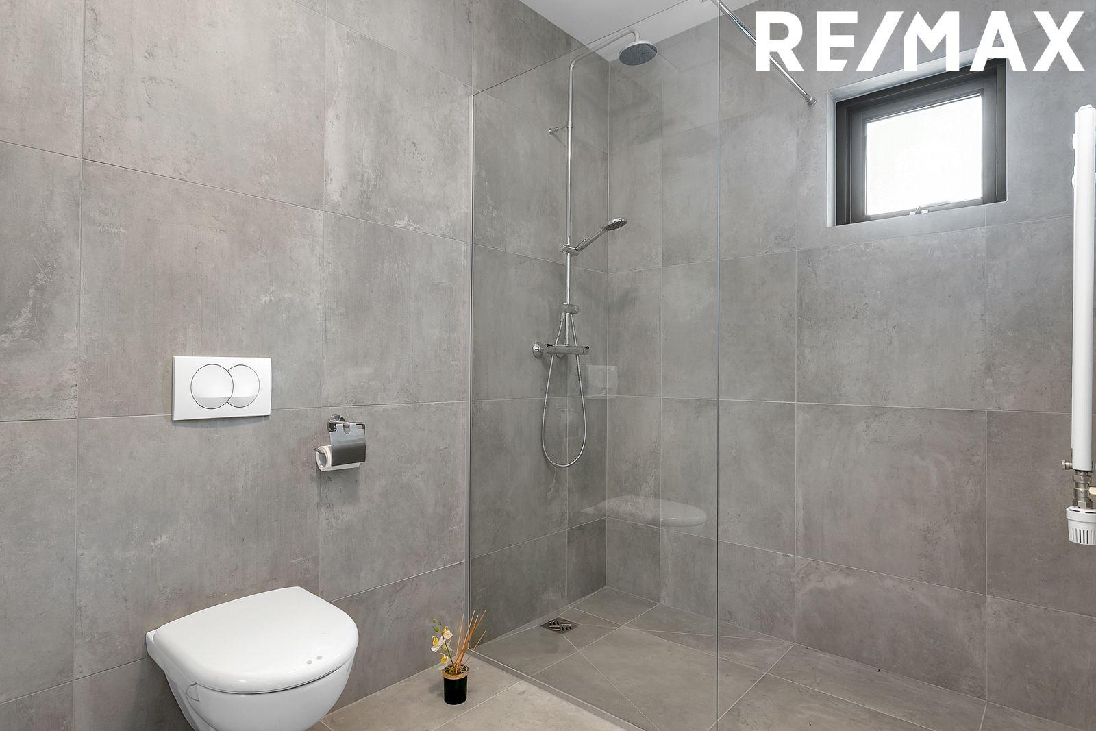 Baðherbergi er með upphengdu salerni, handklæðaofn og gluggi. Innrétting með vaski og hólf fyrir þvottavél og þurrkara. Gólfgeng sturta með glervegg. Vandaðar flísar á gólfi og hluta veggja.