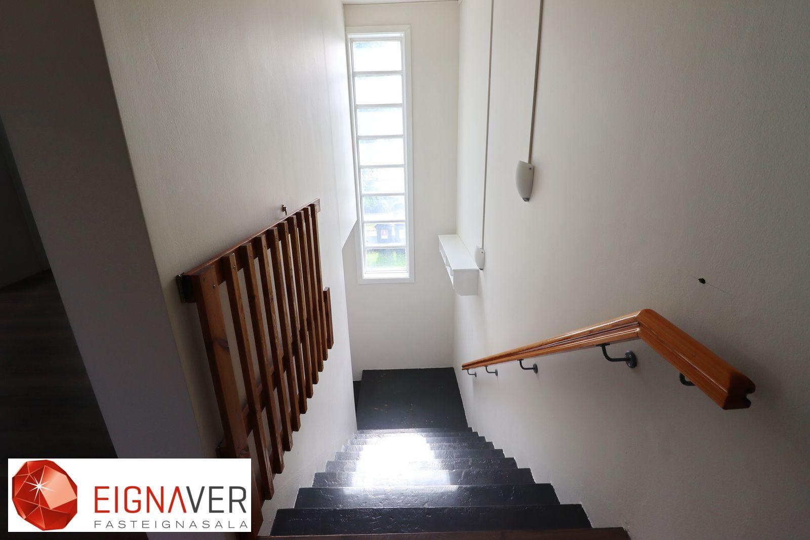 Nánari lýsing: Forstofan er niðri með teppi á gólfum. Stigi steyptur þar sem gengið er upp í íbúð. Hol/Gangur parket á gólfi. Svefnherbergin eru þrjú, parket á gólfum í öllum herbergjum og fataskápur í einu herbergi. Baðherbergi dúkur á gólfi, baðkar, innrétting, gluggi. Stofa parket á gólfi, gengið út á vestursvalir. Eldhús parket á gólfi, ljós eldhúsinnrétting, gott vinnupláss, bjart og rúmgott eldhús, úr eldhúsi er gengið niður í sameiginlegt þvottahús. Geymsla er í dag góð stúdíóíbúð með sérinngangi einnig aðgengileg innan frá. Flísar á gólfi, vaskur, opnanlegur gluggi. Baðherbergi með "walk-in" sturtu, klósett og vaskaskáp, opnanlegur gluggi.