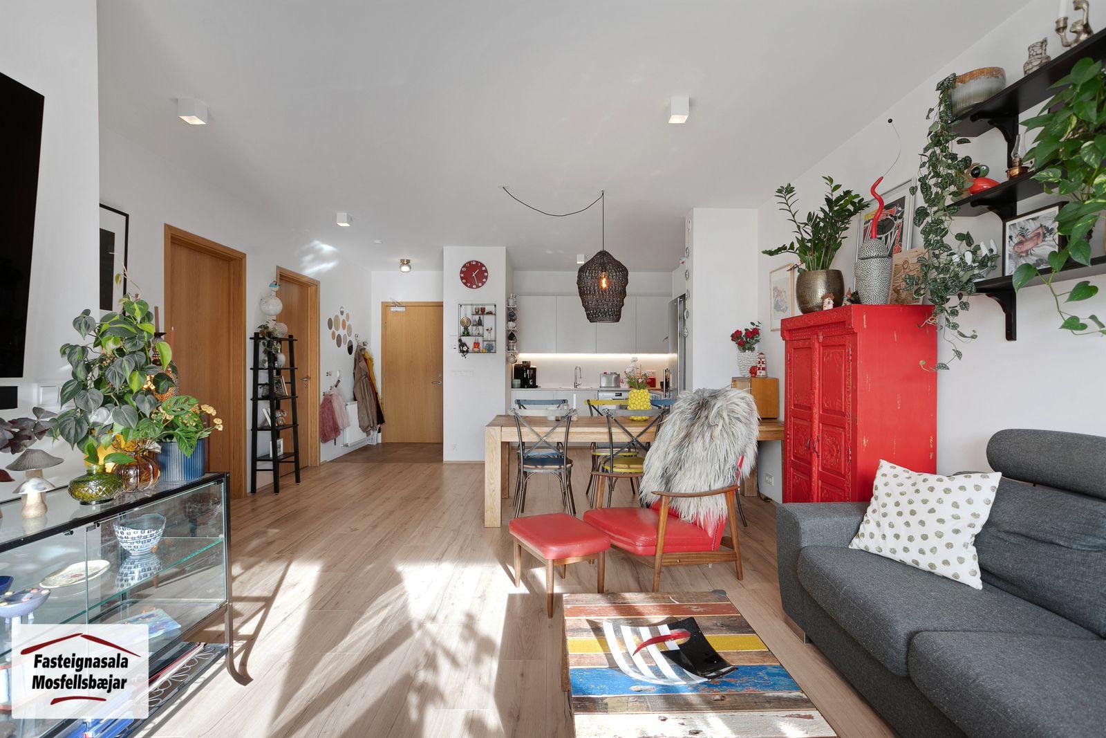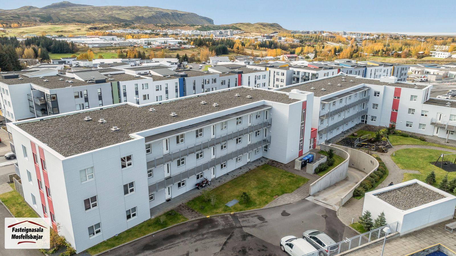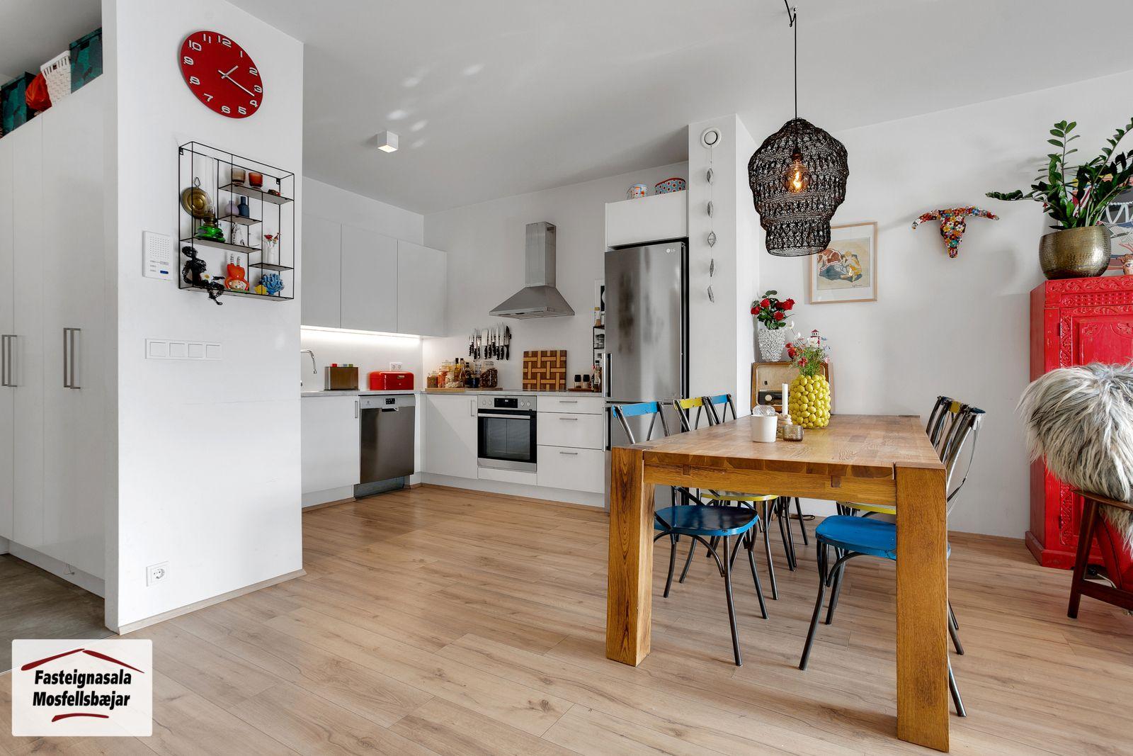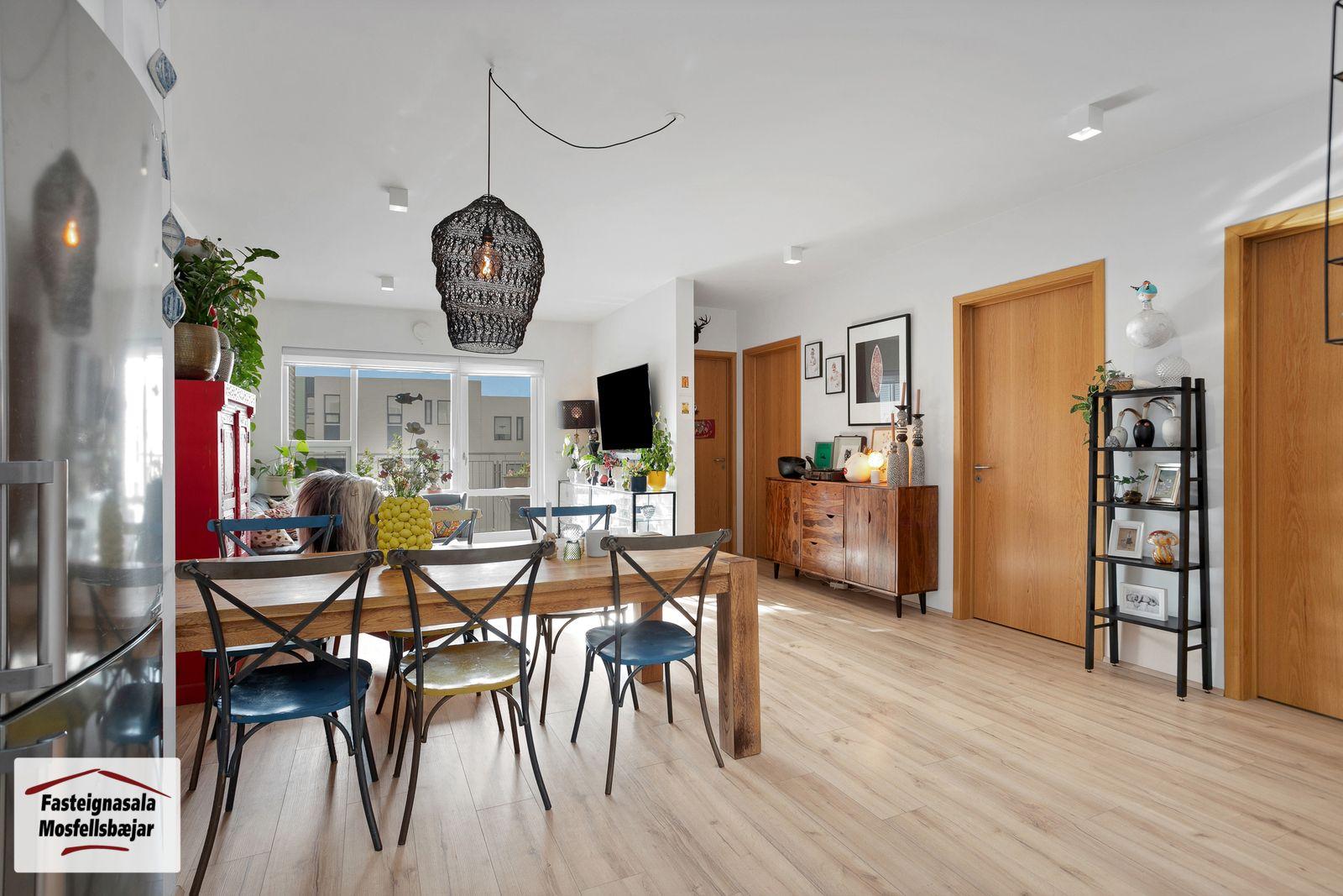 Fasteignasala Mosfellsbæjar kynnir: Björt og falleg 83,0 m2, 3ja herbergja endaíbúð á 2.hæð, ásamt bílastæði í bílageymslu í lyftuhúsi við Vefarastræti 11 í Mosfellsbæ. Eignin skiptist í tvö svefnherbergi, geymslu innan íbúðar, forstofu, baðherbergi, eldhús, stofu og borðstofu. Svalir í suðurátt. Búið er leggja rafmagn að bílastæði í bílakjallara fyrir bílahleðslustöð. Einnig er búið er að setja upp sameignilegar hleðslustöðvar á lóð. Frábær staðsetning rétt við grunn- og leikskóla, Helgafellsskóla, ekki þarf að fara yfir götu til að fara í skólann. Stutt í fallegar gönguleiðir og útivistarsvæði. Stutt í strætóstoppistöð.Smelltu hér til að fá söluyfirlit sent.