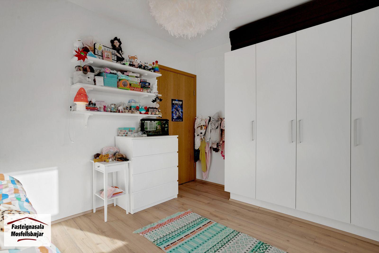 Barnaherbergi er með fataskáp og parketi á gólfi.