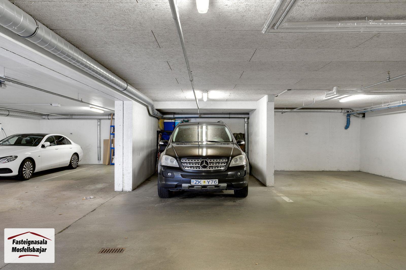 Bílastæði í lokaðri bílageymslu, merkt B14, fylgir eigninni. Rafmagn er til staðar í bílakjallara og því möguleiki á að fá hleðslustöð í bílastæði í bílakjallara.