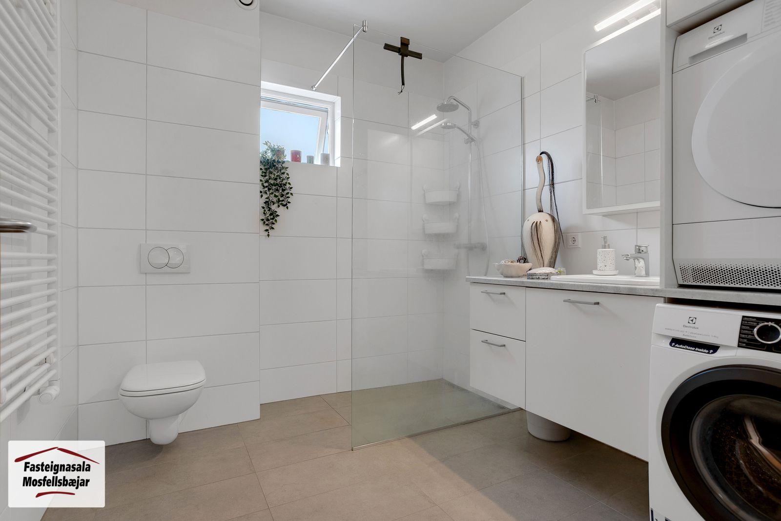 Baðherbergi er flísalagt í hólf og gólf með innréttingu frá HTH, vegghengdu salerni, handklæðaofni og sturtu. Tengi er fyrir þvottavél og þurrkara á baðherbergi. Gluggi er á baðherbergi.