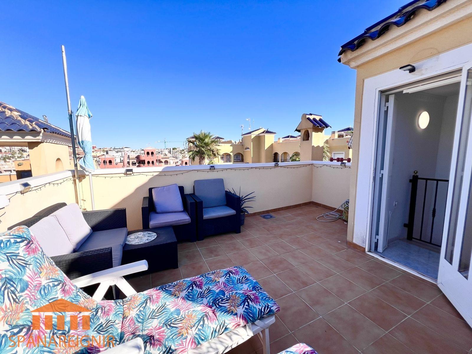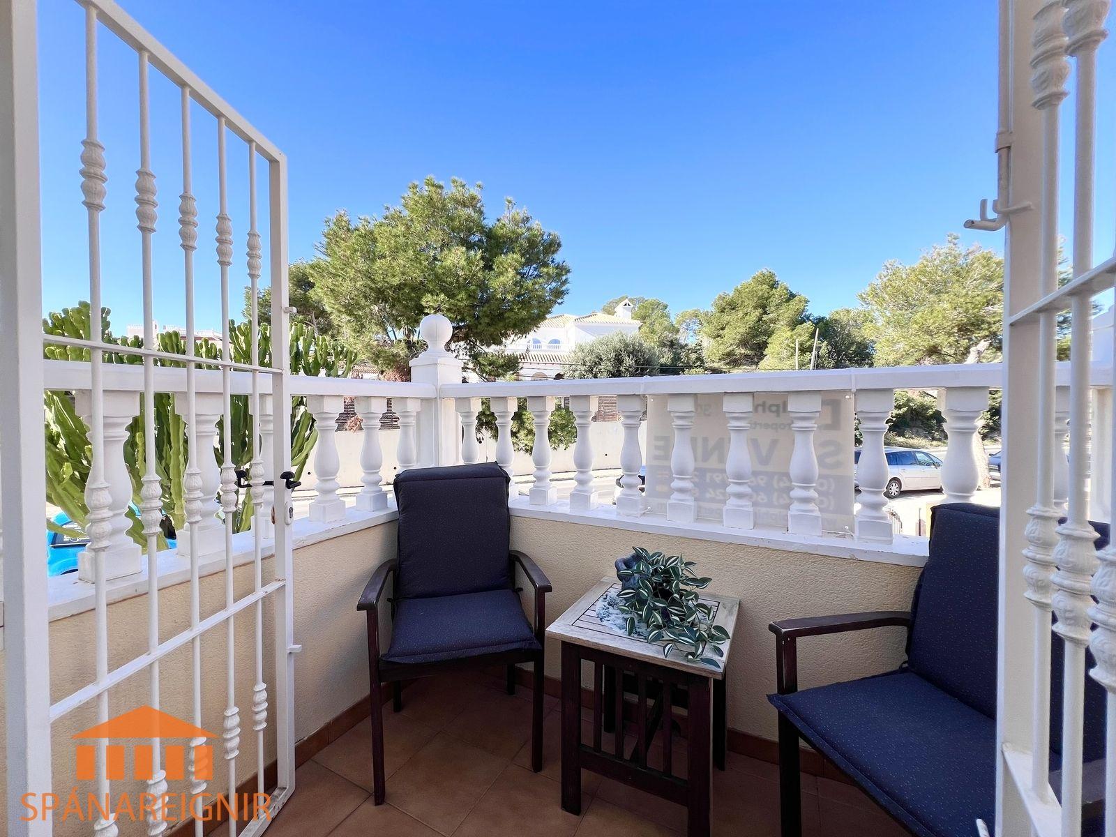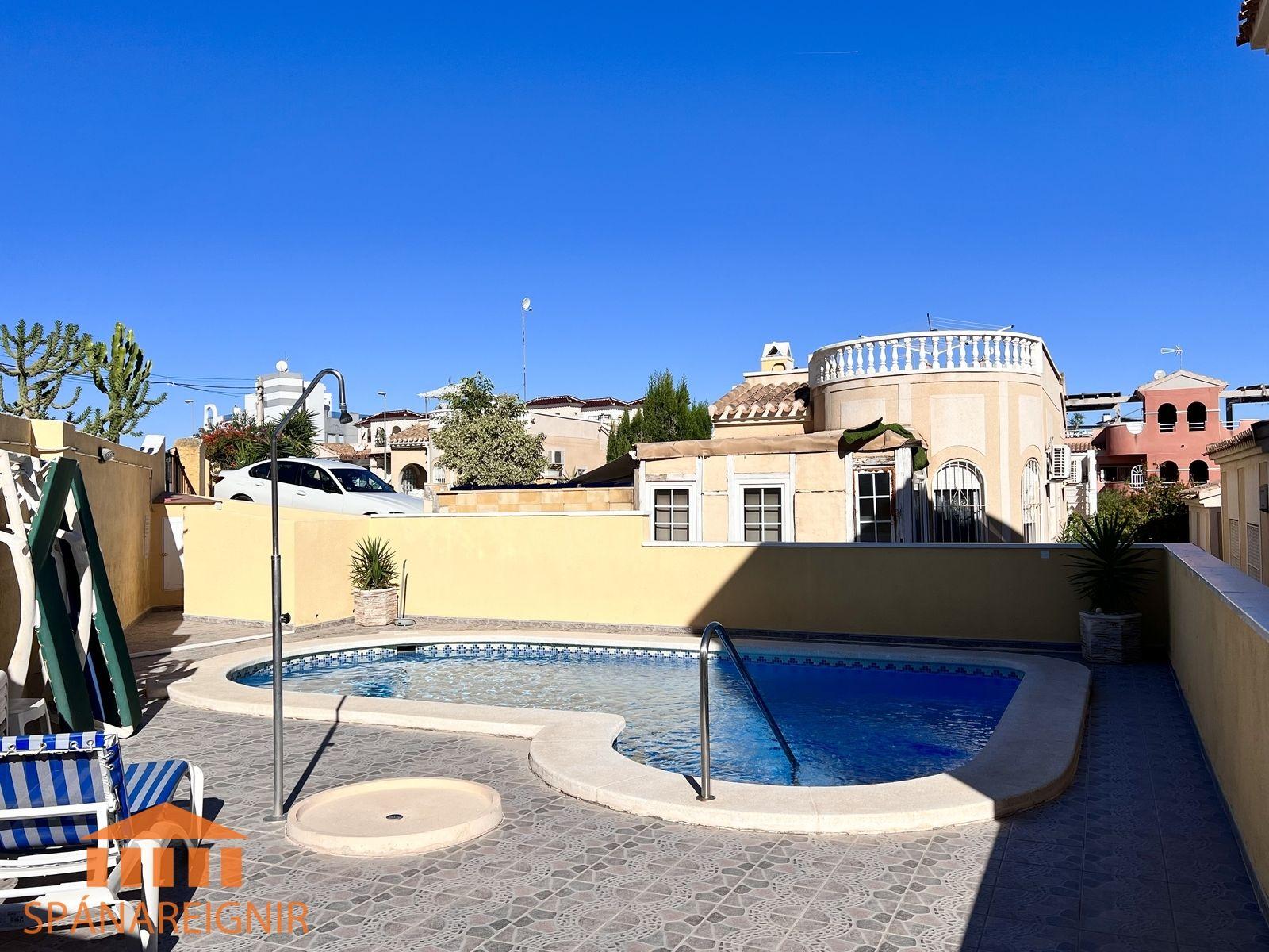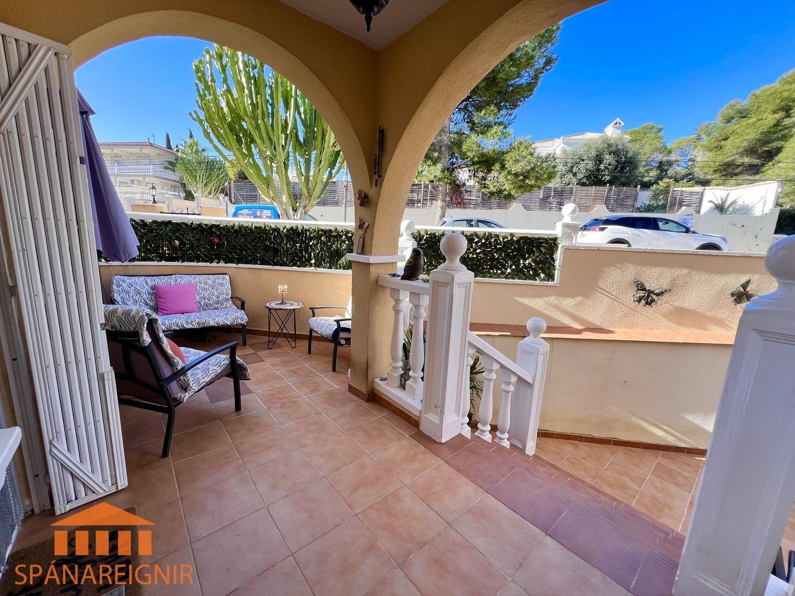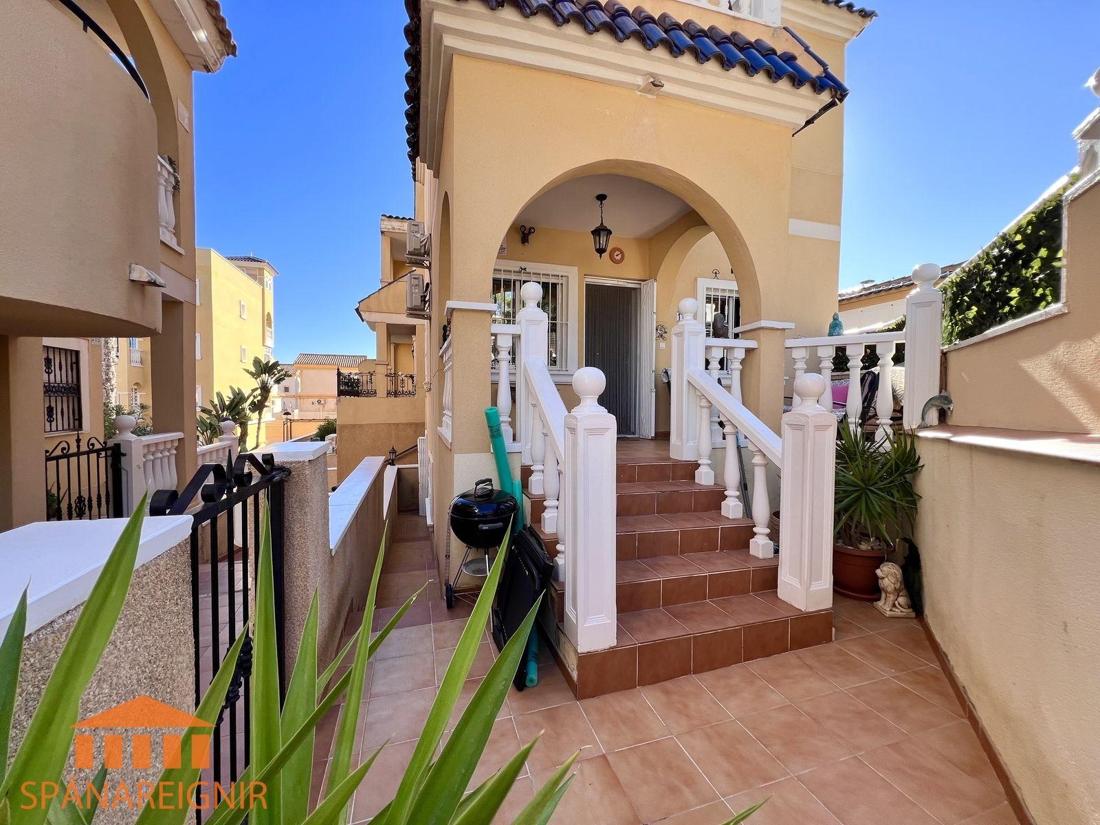 SPÁNAREIGNIR KYNNIR: *4RA HERBERGJA HÚS MEÐ STUDIO ÍBÚÐ* *3 SVEFNH. OG 3 BAÐH.* *ÞAKSVALIR MEÐ SJÁVARÚTSÝNI OG GARÐUR* *SAMEIGINLEG SUNDLAUG NOKKRUM SKREFUM FRÁ* *FRÁBÆR STAÐSETNING Í GÖNGUFÆRI VIÐ VERSLANIR OG VEITINGASTAÐI* *STUTT Í GOLF OG STRÖND*Mikið endurnýjað 4ra herbergja hús á þessum vinsæla stað í Villamartin, í göngufæri við alla helstu þjónustu. Á fyrstu hæð er endurnýjað og rúmgott eldhús, opið við stofu. Stofan er rúmgóð og á hæðinni er einnig gestasnyrting með glugga. Gengið er upp á efri hæð og þar eru tvö rúmgóð svefnherbergi með skápum, og baðherbergi með sturtu og glugga. Annað svefnherbergið er einnig með útgengi út á svalir. Eigninni fylgja þaksvalir þar sem er hægt að njóta sólarinnar og útsýnis til sjávar.
