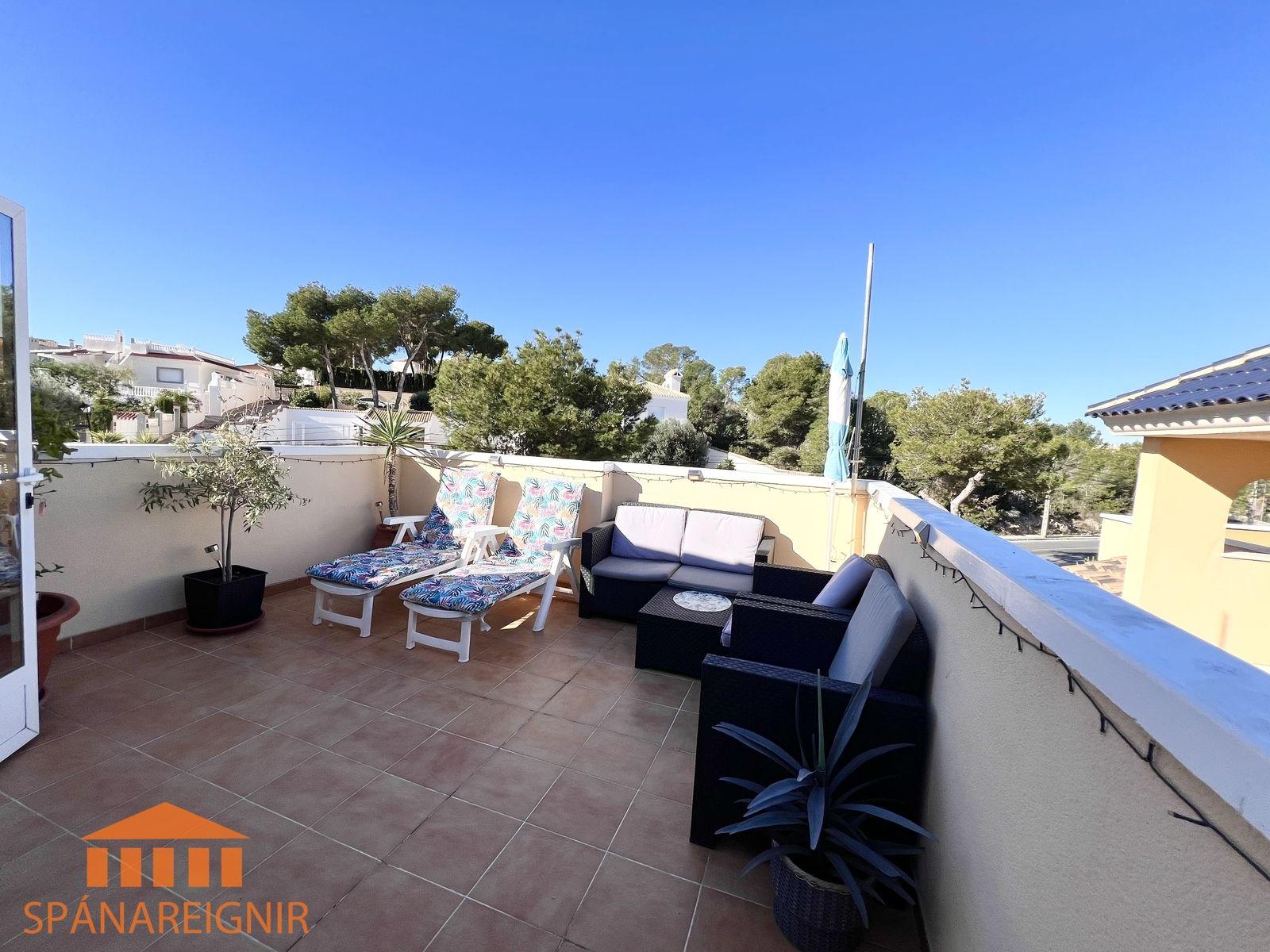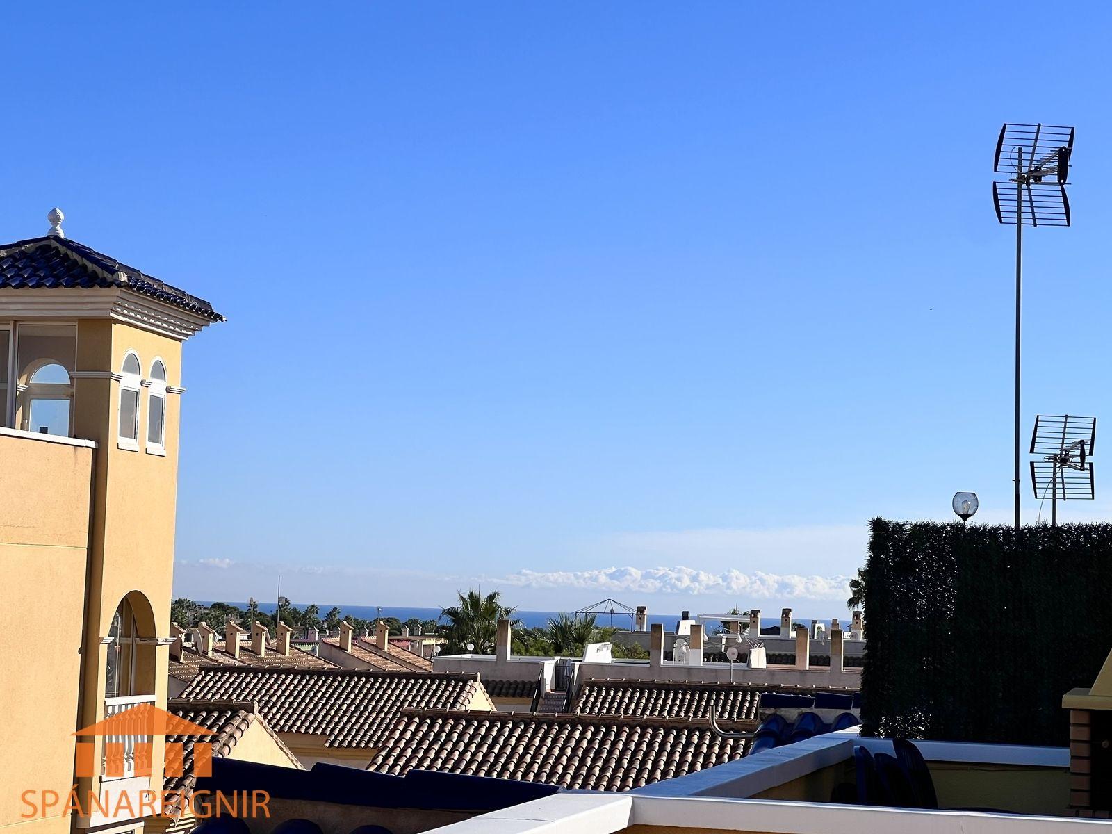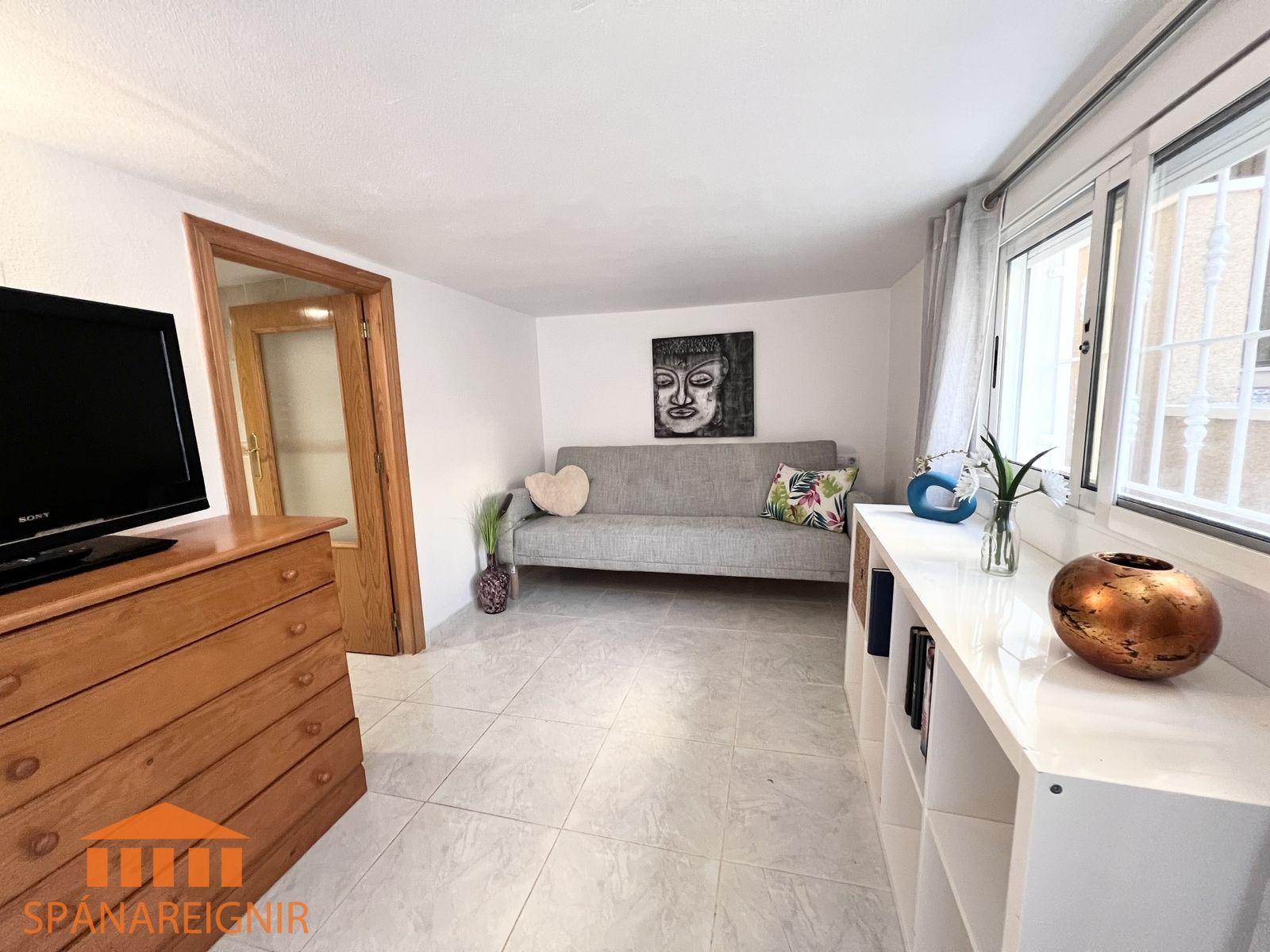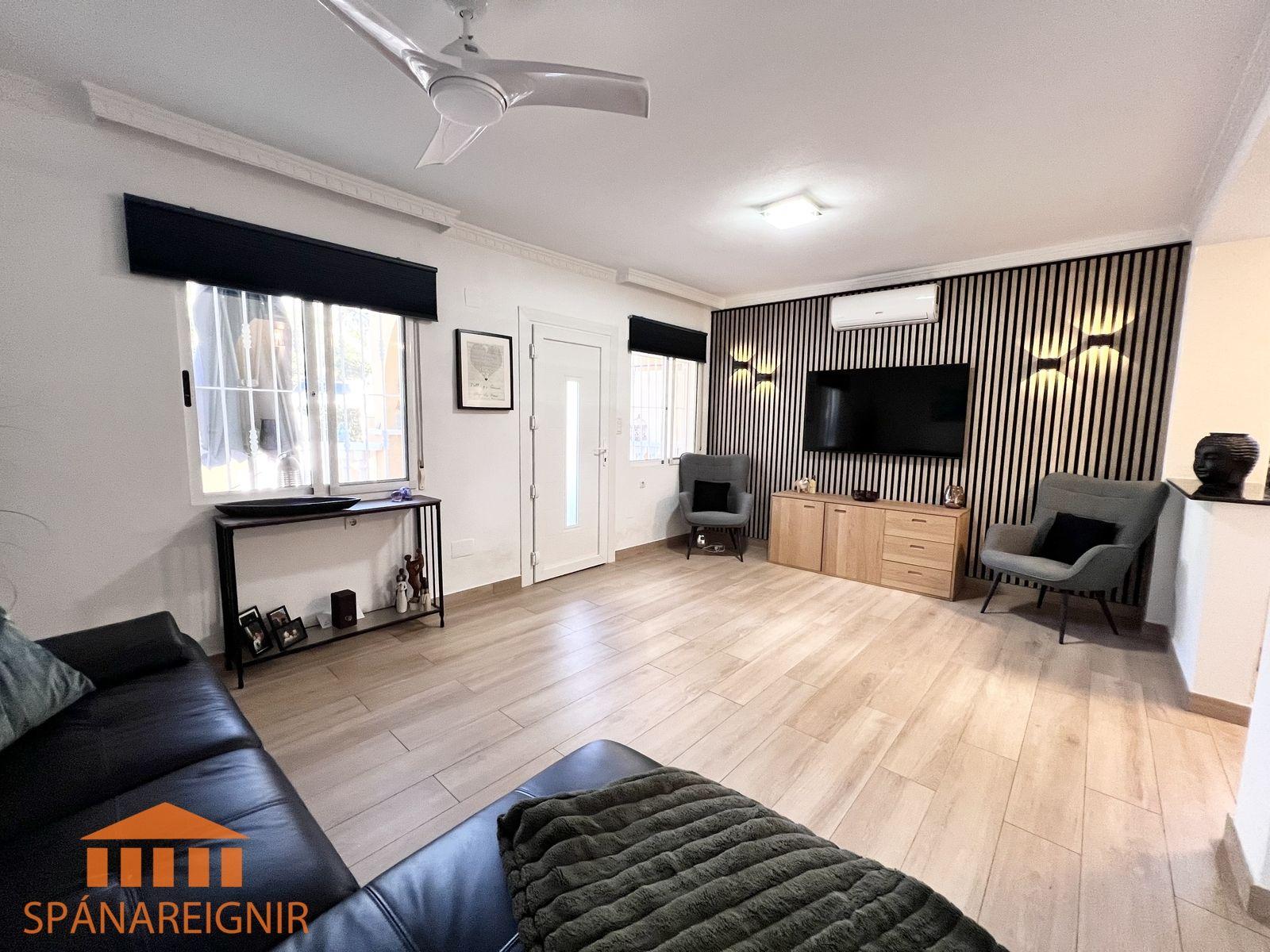 SPÁNAREIGNIR KYNNIR: *4RA HERBERGJA HÚS MEÐ STUDIO ÍBÚÐ* *3 SVEFNH. OG 3 BAÐH.* *ÞAKSVALIR MEÐ SJÁVARÚTSÝNI OG GARÐUR* *SAMEIGINLEG SUNDLAUG NOKKRUM SKREFUM FRÁ* *FRÁBÆR STAÐSETNING Í GÖNGUFÆRI VIÐ VERSLANIR OG VEITINGASTAÐI* *STUTT Í GOLF OG STRÖND*Mikið endurnýjað 4ra herbergja hús á þessum vinsæla stað í Villamartin, í göngufæri við alla helstu þjónustu. Á fyrstu hæð er endurnýjað og rúmgott eldhús, opið við stofu. Stofan er rúmgóð og á hæðinni er einnig gestasnyrting með glugga. Gengið er upp á efri hæð og þar eru tvö rúmgóð svefnherbergi með skápum, og baðherbergi með sturtu og glugga. Annað svefnherbergið er einnig með útgengi út á svalir. Eigninni fylgja þaksvalir þar sem er hægt að njóta sólarinnar og útsýnis til sjávar.