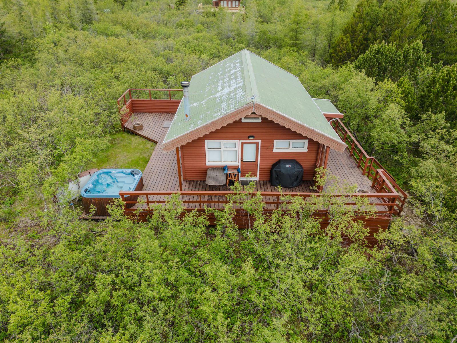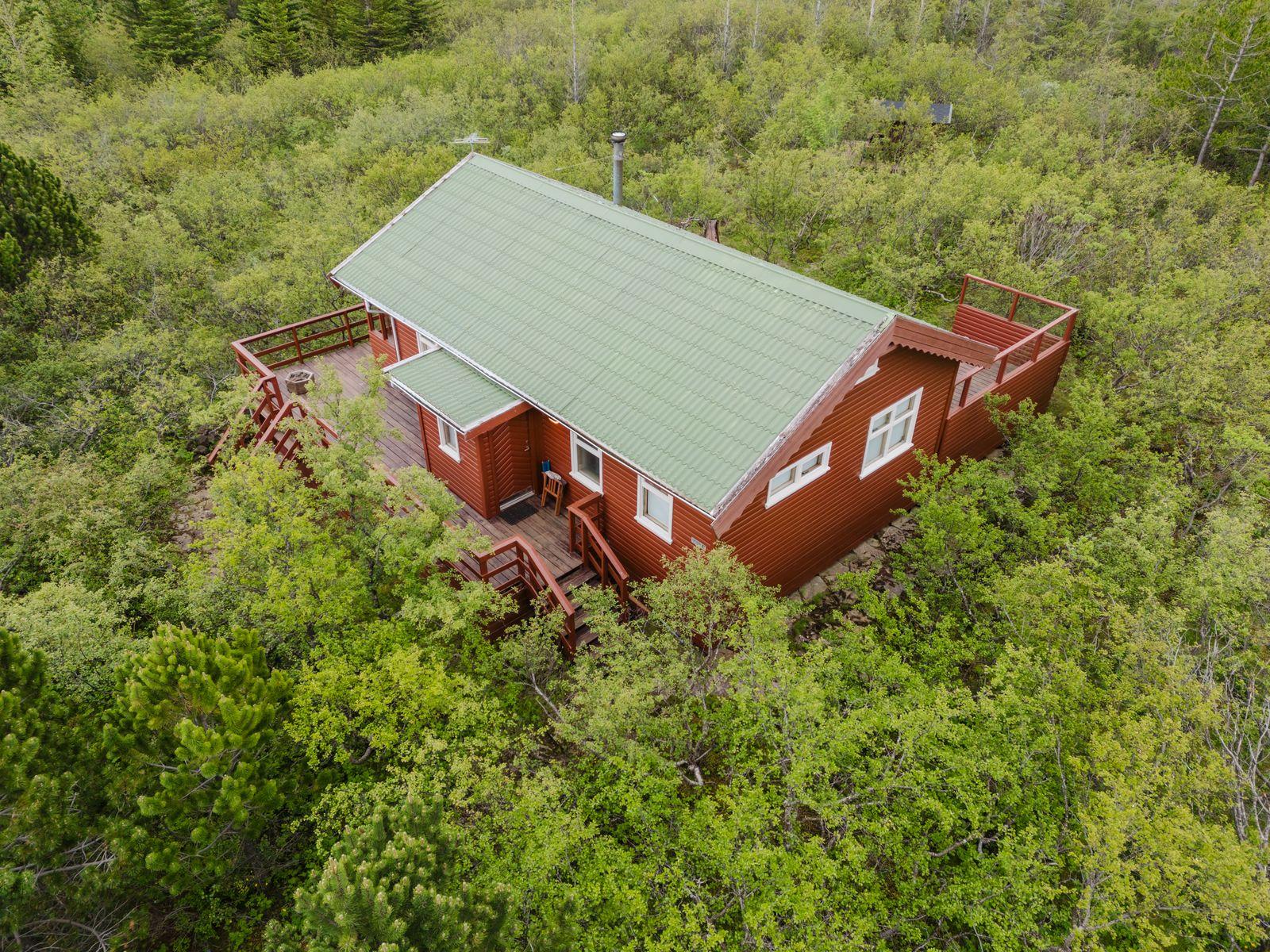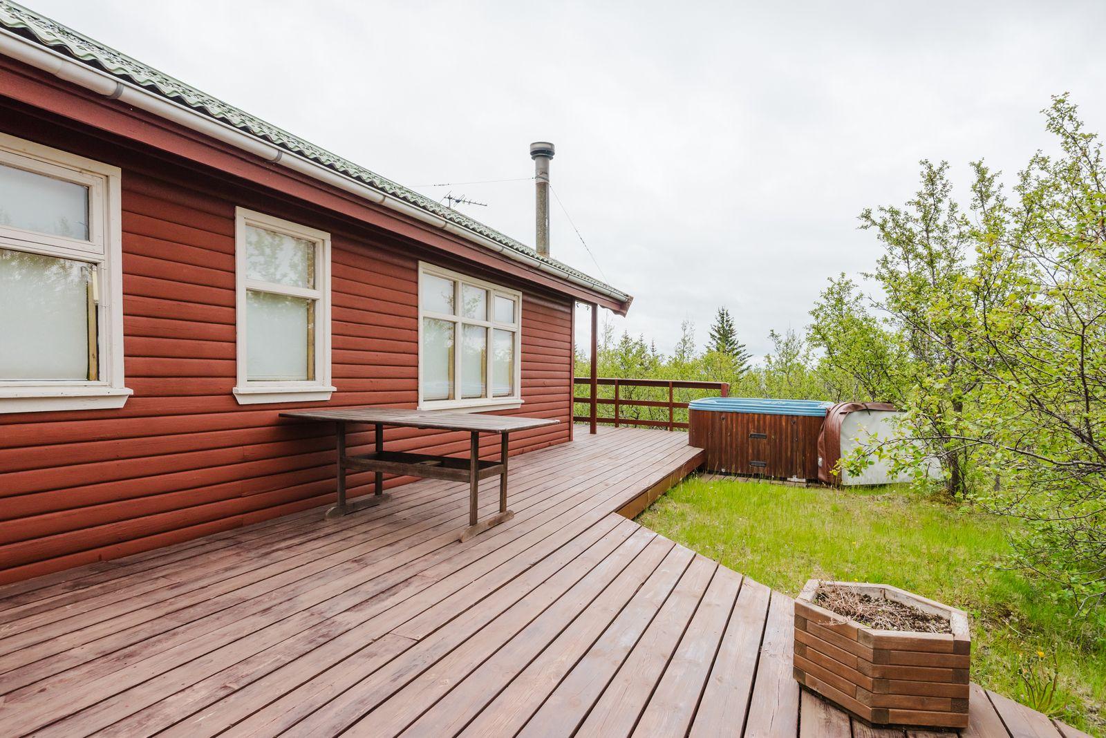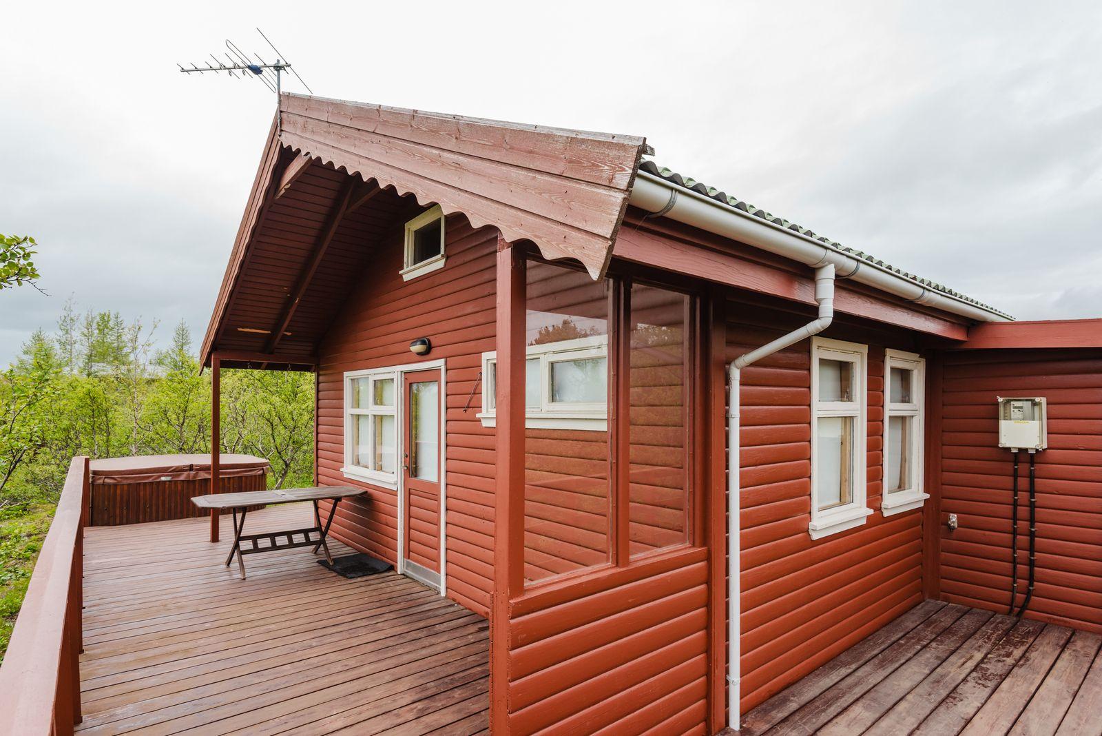 Um ræðir fallegt timburhús 57m2 að grunnfleti byggt 1987. Húsið er klætt með láréttri vatnsklæðningu- vel málað. Góðir pallar umhverfis húsið og heitur pottur ( rafmagns). Járn á þaki. Þakið þarfnast málningar. Að innan er húsið panelklætt með spónaparketti á gólfum. Svefnloft fyrir 2-3. Frárennsli og rotþró var endurnýjað árið 2007. Búið er að skipta um hluta af rúðunum undanfarin ár.