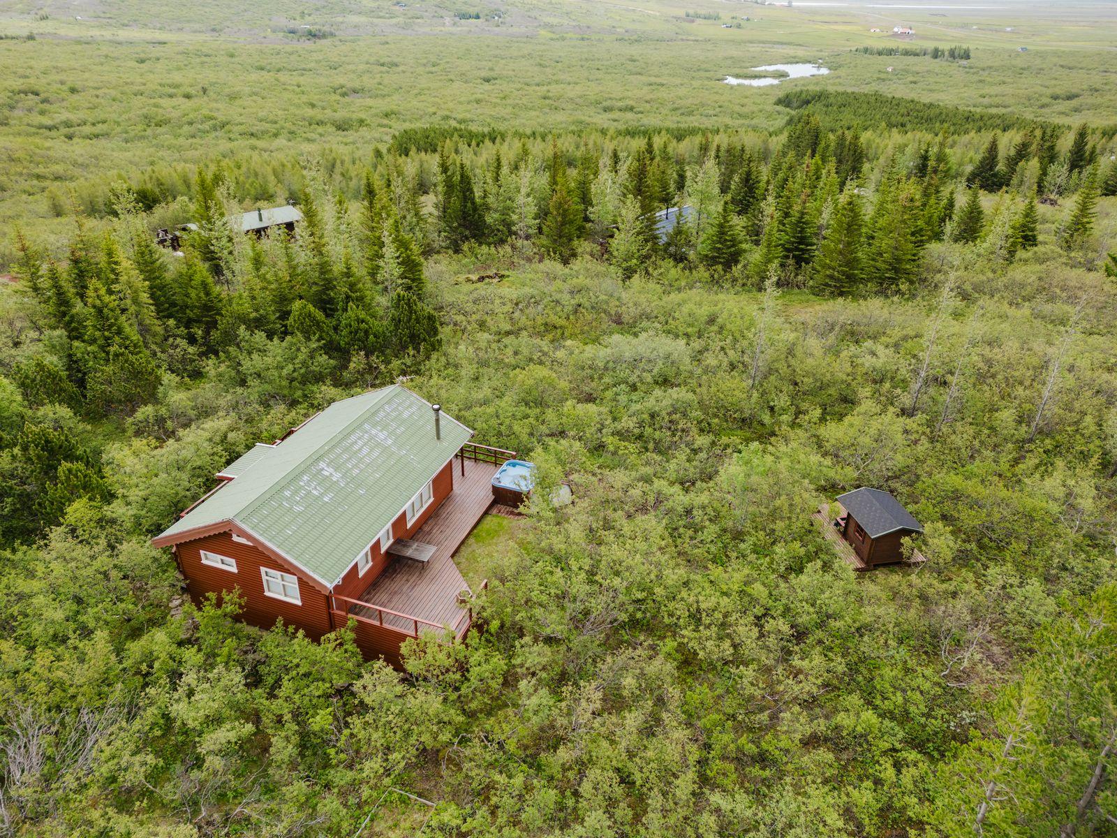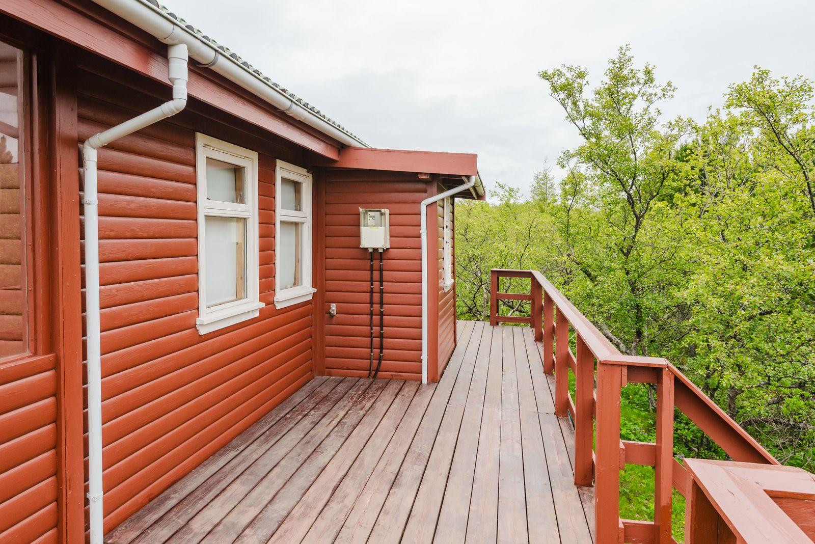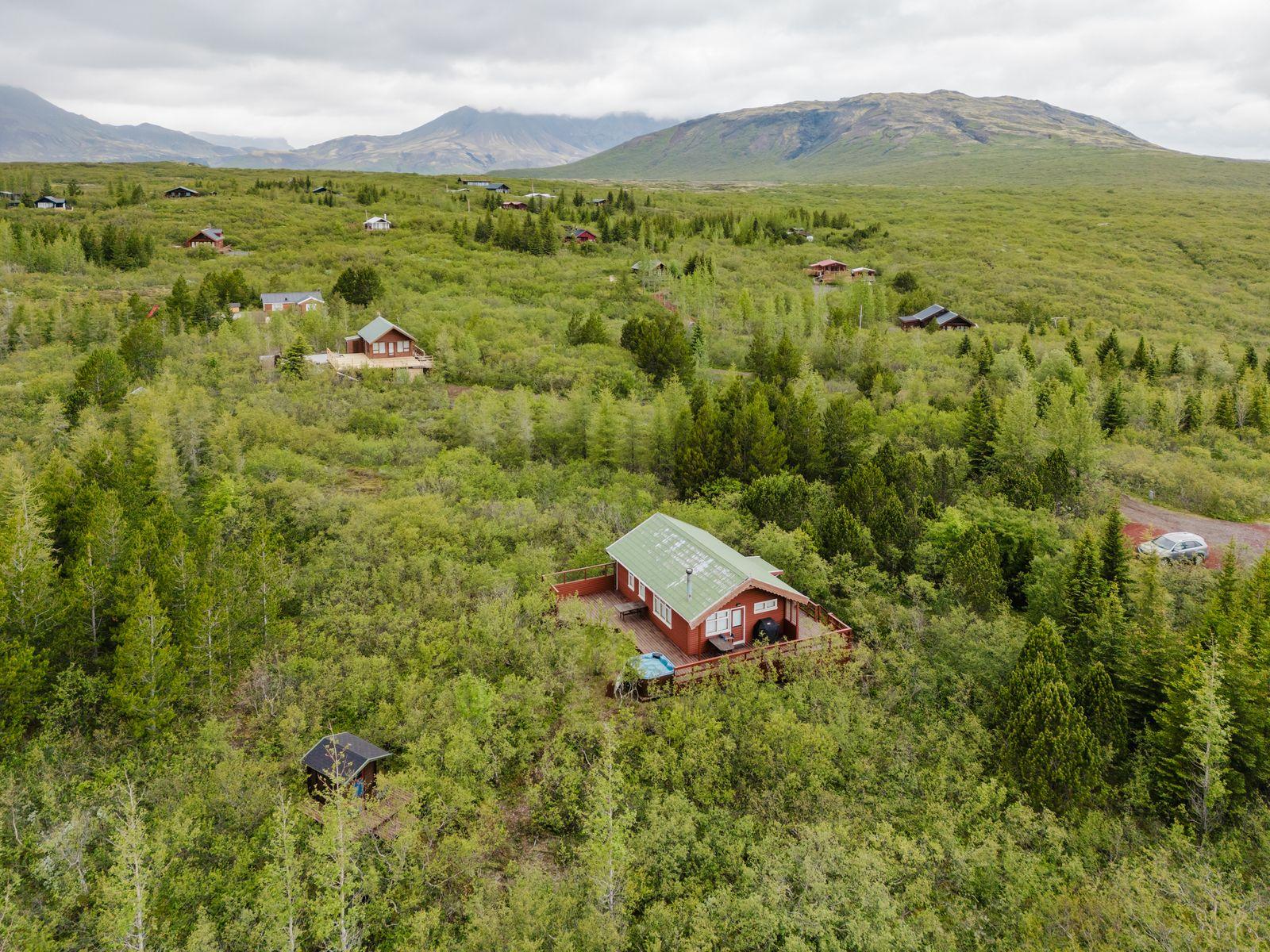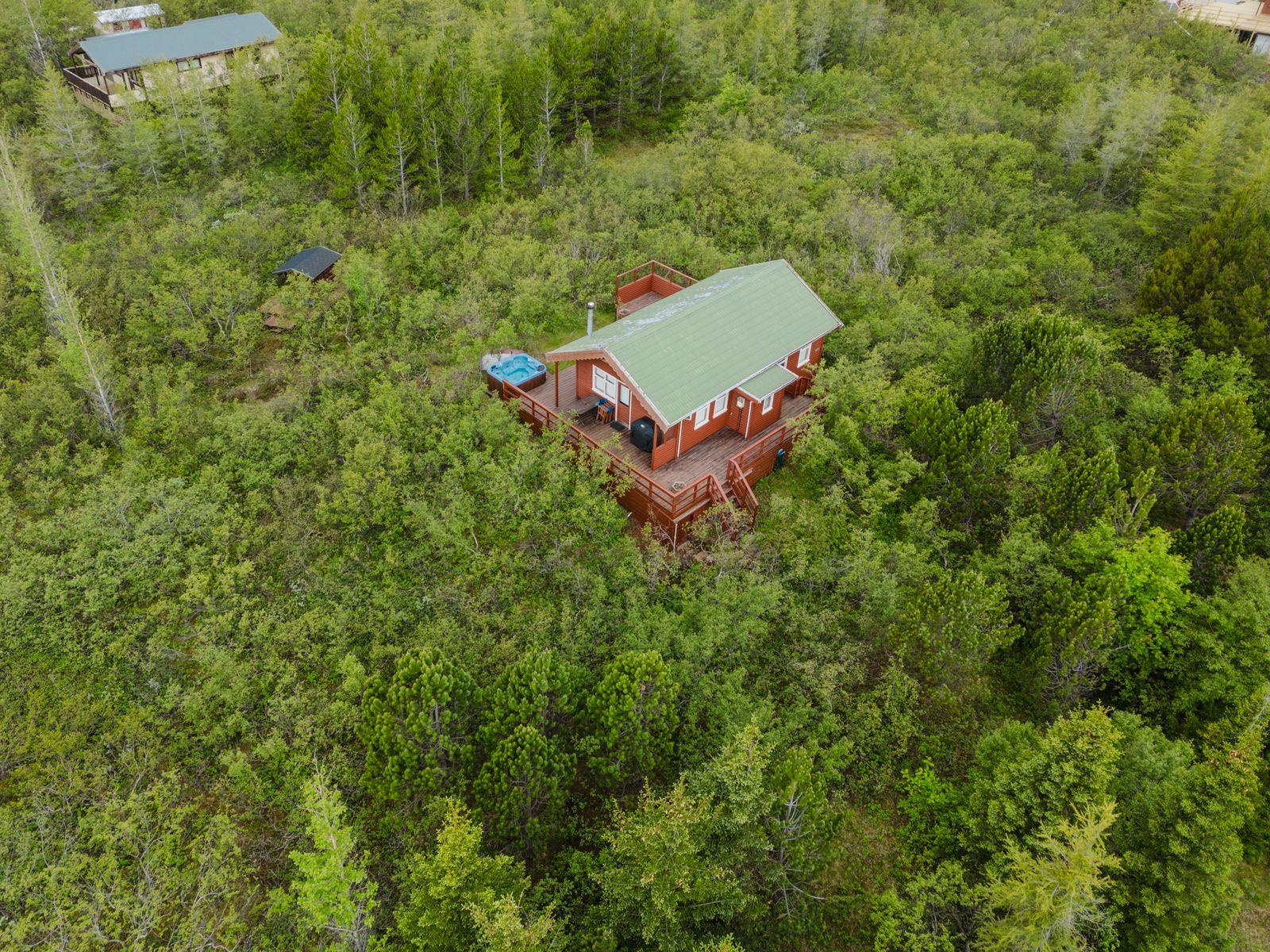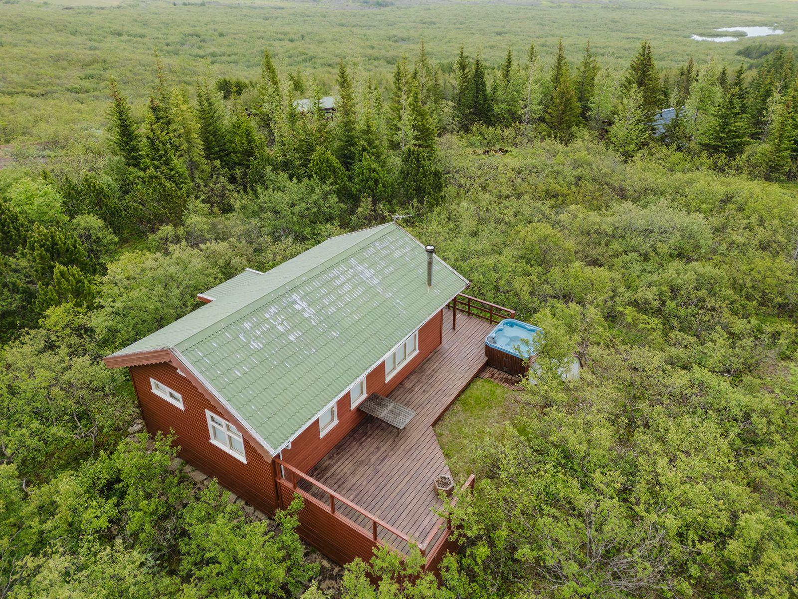Um ræðir fallegt timburhús 57m2 að grunnfleti byggt 1987. Húsið er klætt með láréttri vatnsklæðningu- vel málað. Góðir pallar umhverfis húsið og heitur pottur ( rafmagns). Járn á þaki. Þakið þarfnast málningar. Að innan er húsið panelklætt með spónaparketti á gólfum. Svefnloft fyrir 2-3. Frárennsli og rotþró var endurnýjað árið 2007. Búið er að skipta um hluta af rúðunum undanfarin ár.