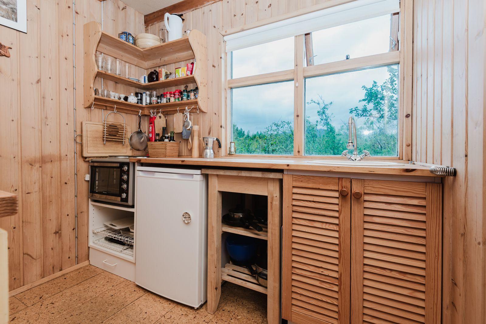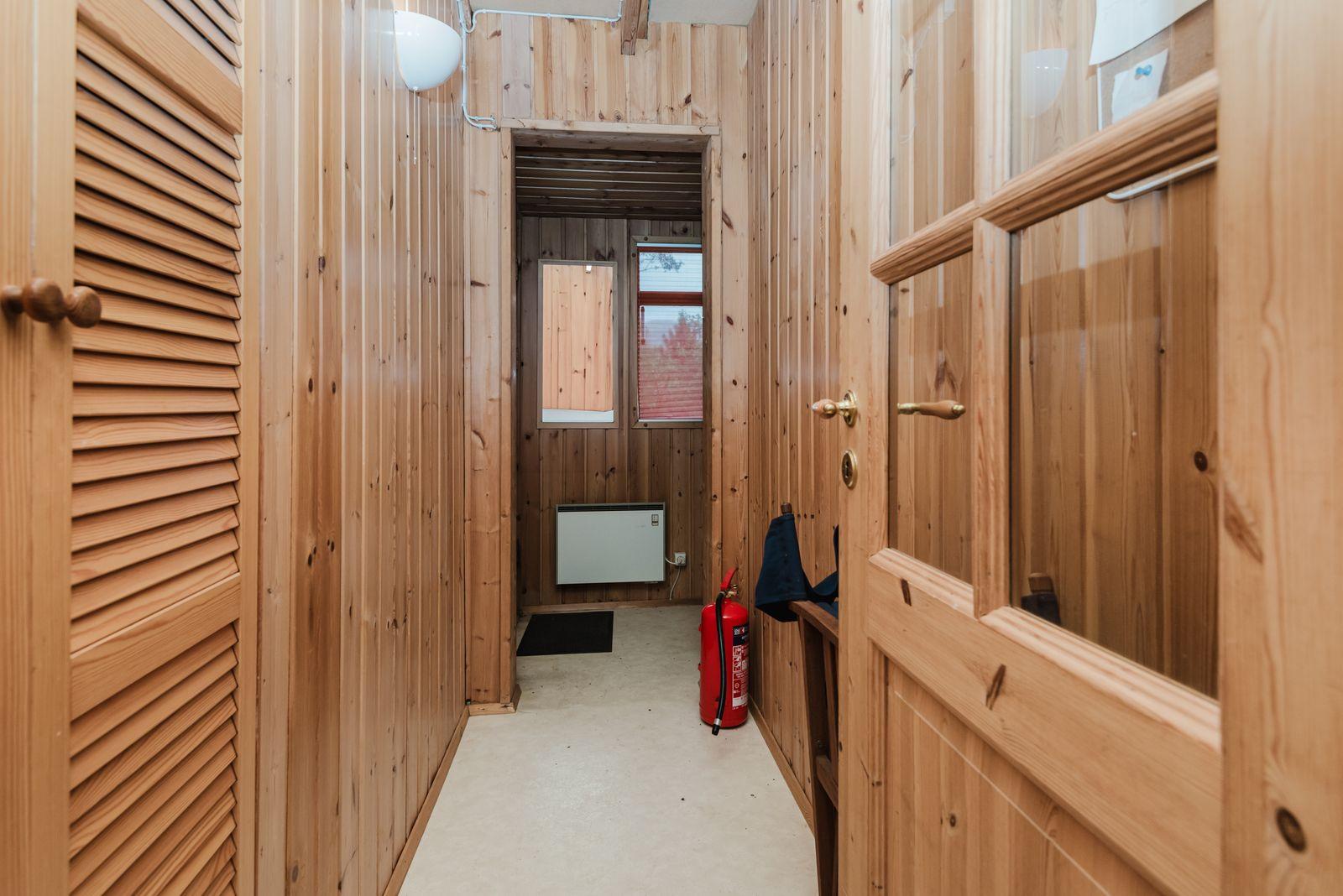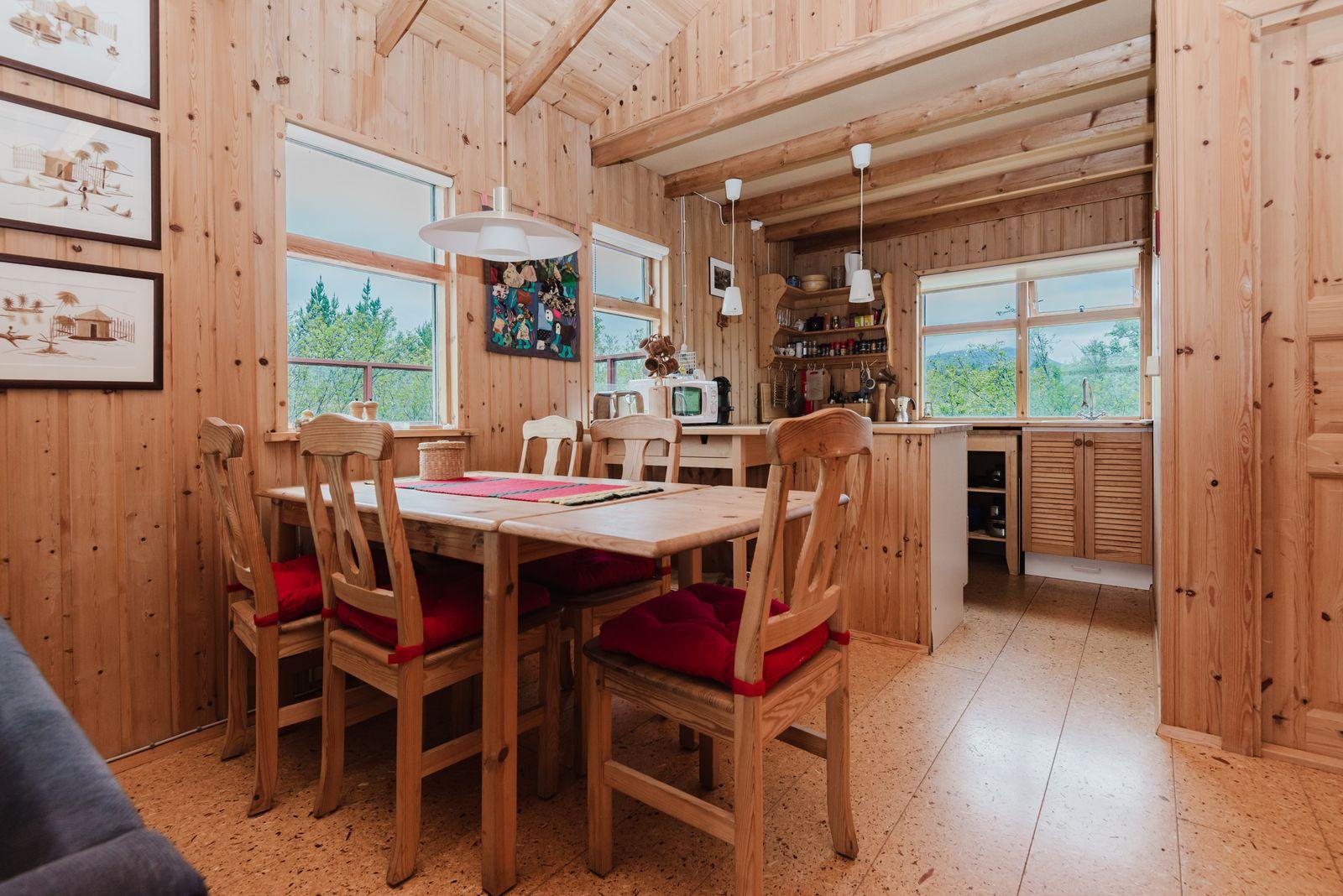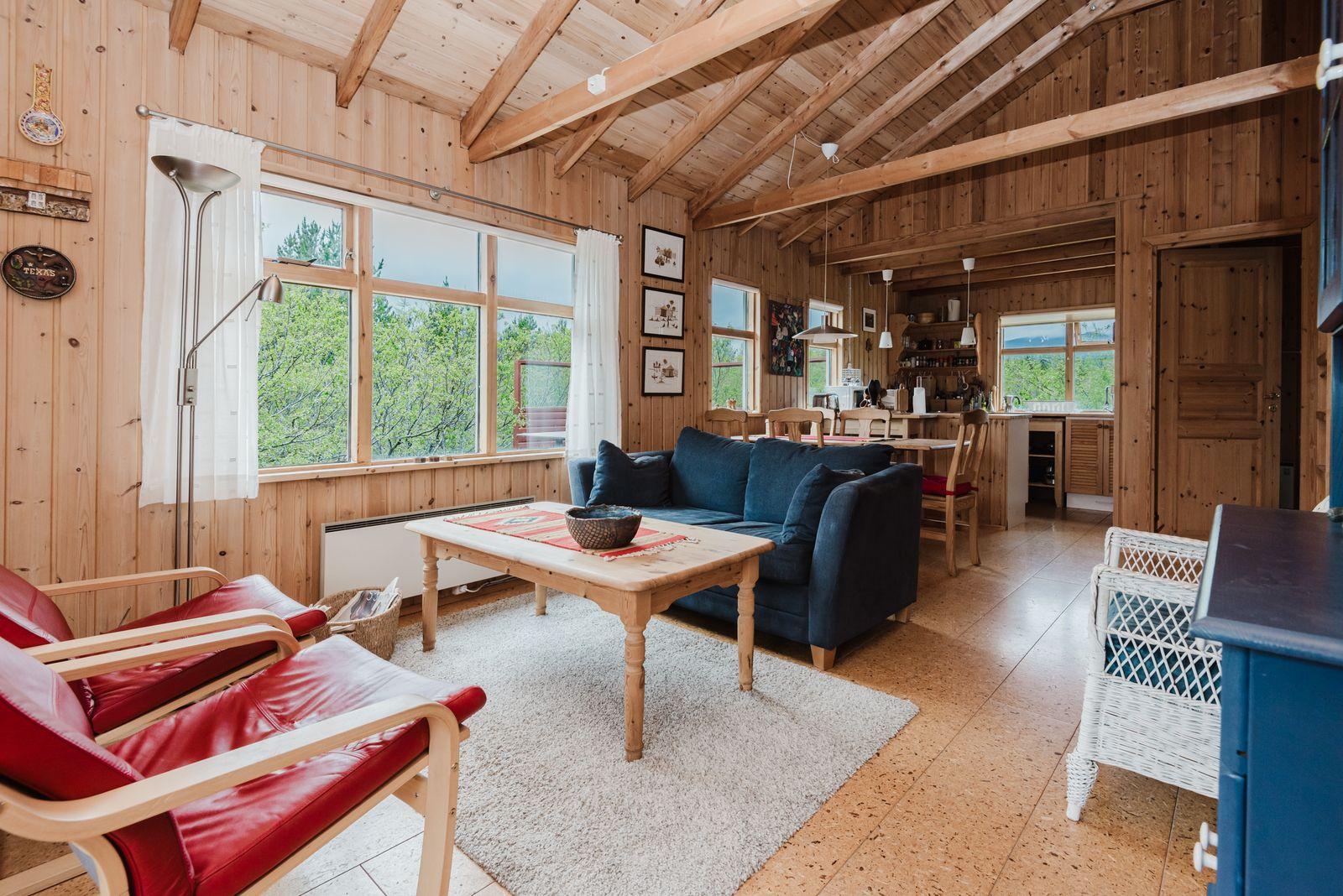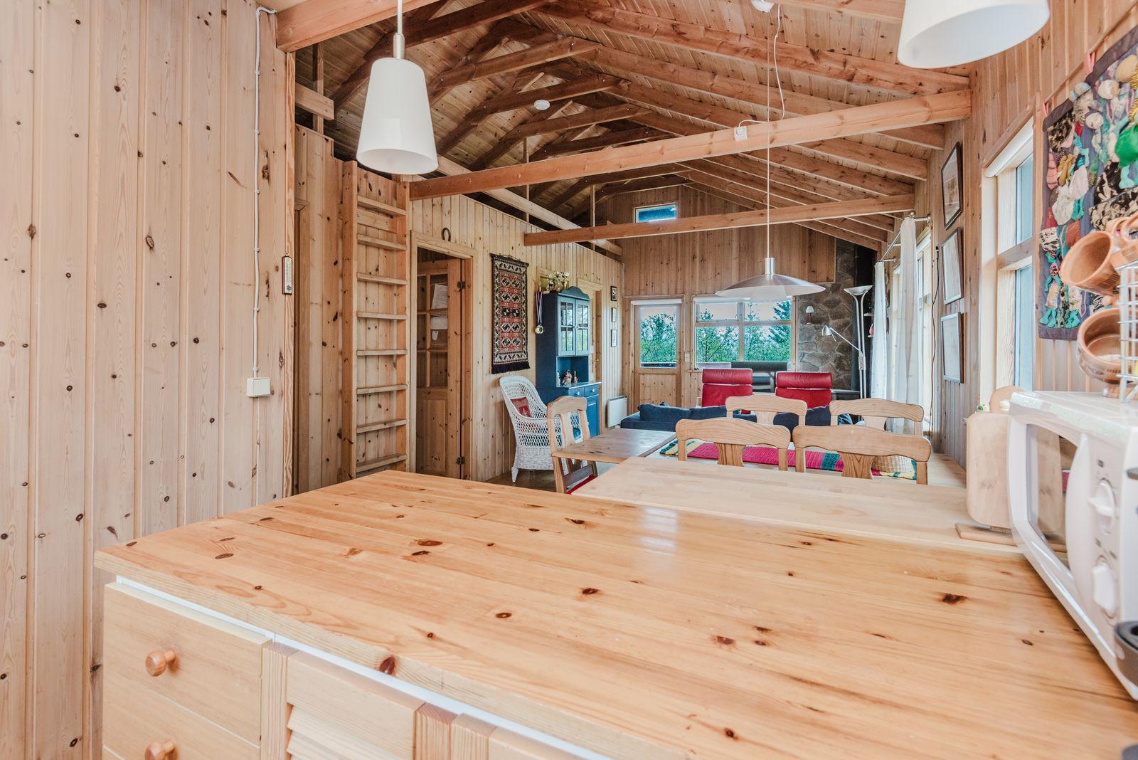 Eignin skiptist í anddyri, stofu/skála, eldhús með upprunalegri innréttingu, baðherbergi og 2 svefnherbergi. Svefnpláss fyrir 6-7 i húsinu – upptekið loft, panelklætt. Kamína í stofunni með strompi. Geymsla er undir pallinum.