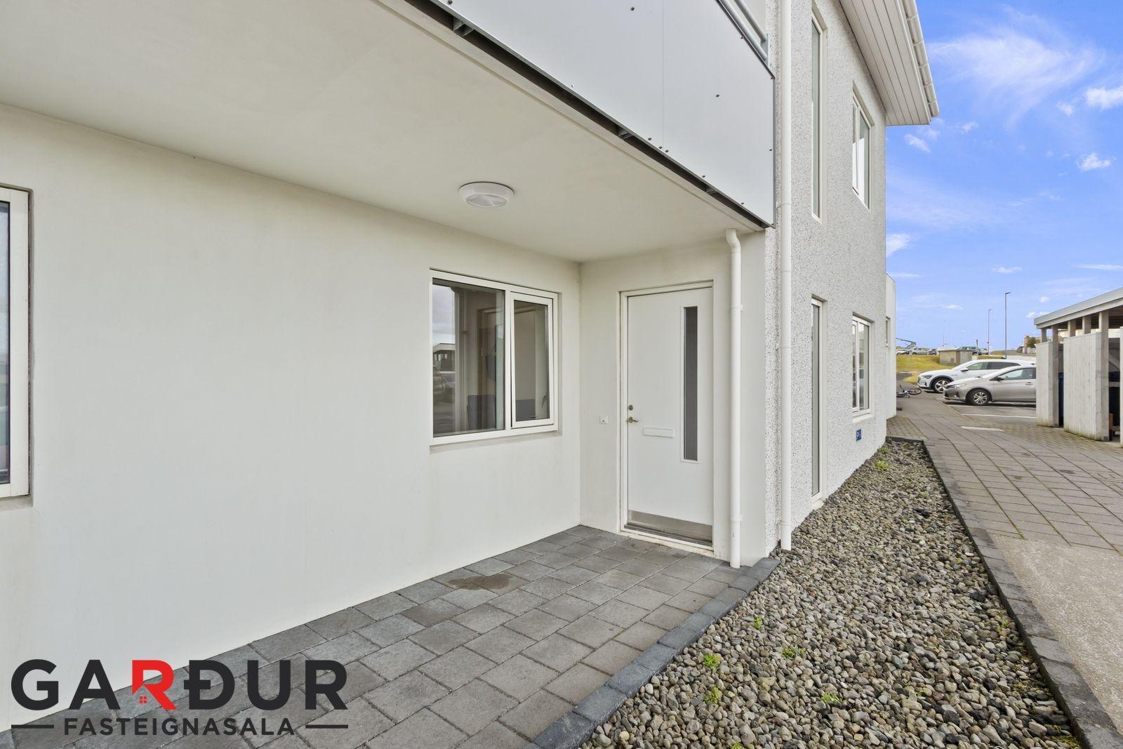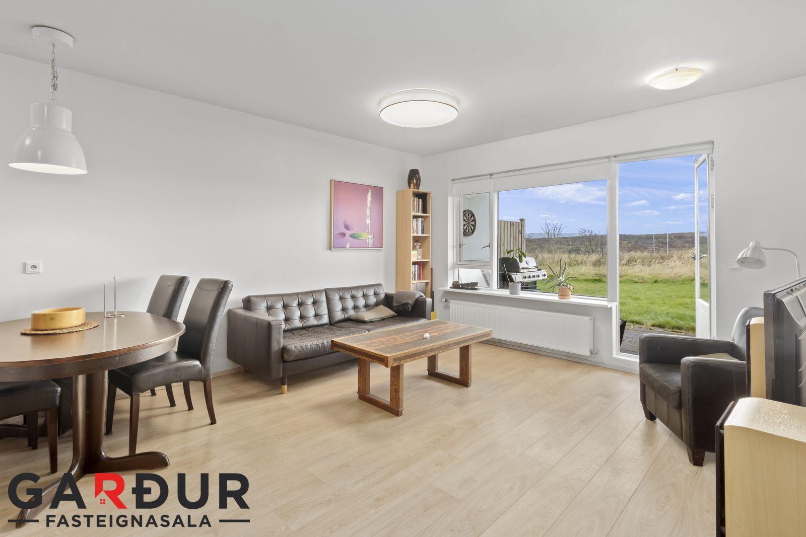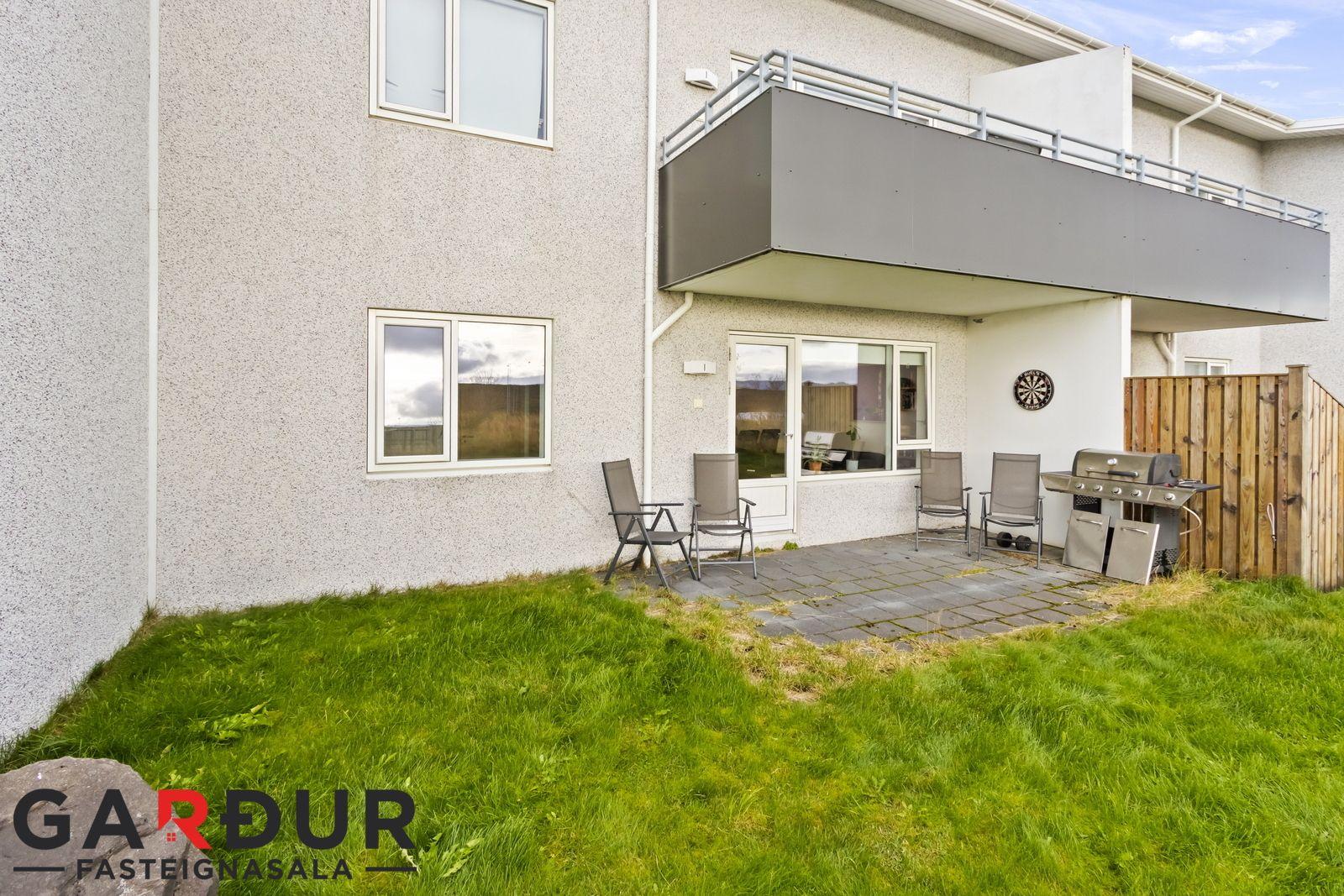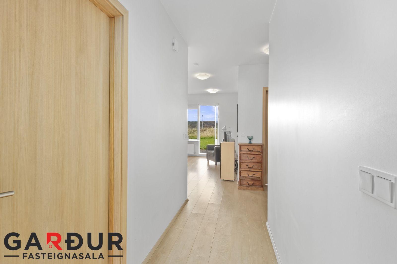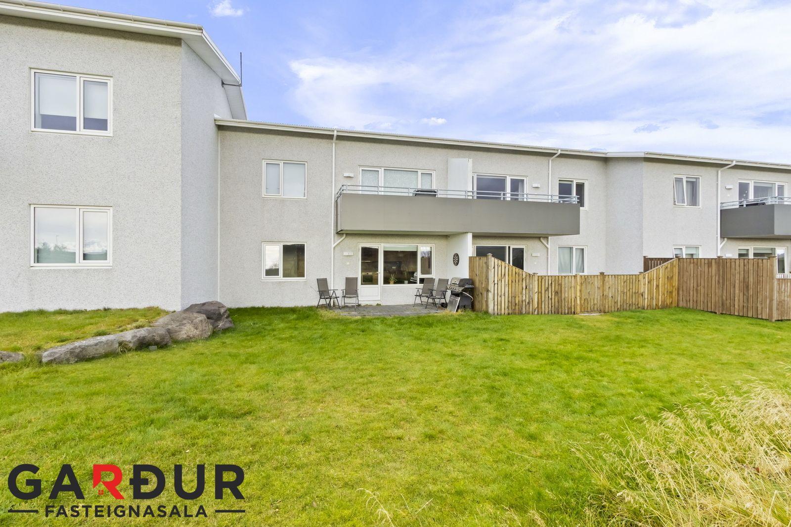 Nánari lýsing: Forstofa með fataskáp, flísar á gólfi. Stofa og eldhús eru í opnu alrými með gluggum til suðurs, parket á gólfi og útgengt á sérverönd til suðurs. Möguleiki er á að byggja sólpall. Eldhús, vönduð innrétting með eikaráferð frá Axis, gott vinnupláss og tengi fyrir uppþvottavél, parket á gólfi. Svefnherbergi I með fataskáp, parket á gólfi. Svefnherbergi II með fataskáp, parket á gólfi. Geymsla / svefnherbergi III með glugga og er innan íbúðar, er geymsla á teikningu en notað sem svefnherbergi í dag, parket á gólfi. Baðherbergi, flísalagt með innréttingu og góðum skápum, sturtu og upphengdu salerni. Þvottahús, flísalagt með borðplötu, skolvask, geymslu hillum og aðstöðu fyrir þvottavél og þurrkara.