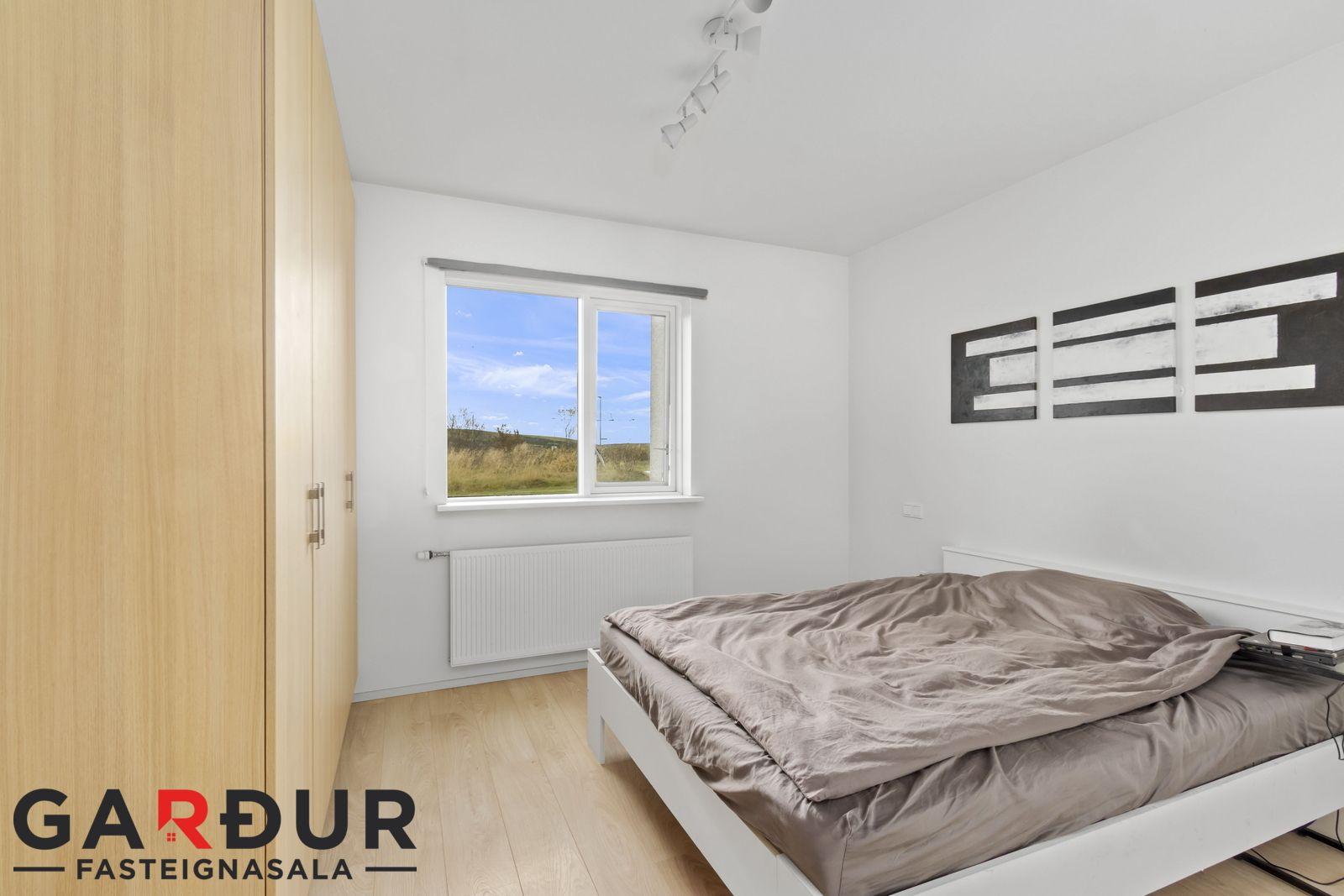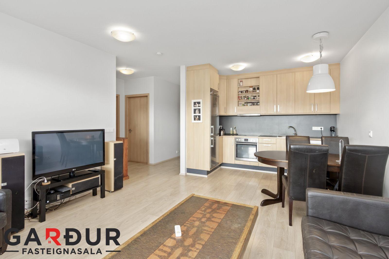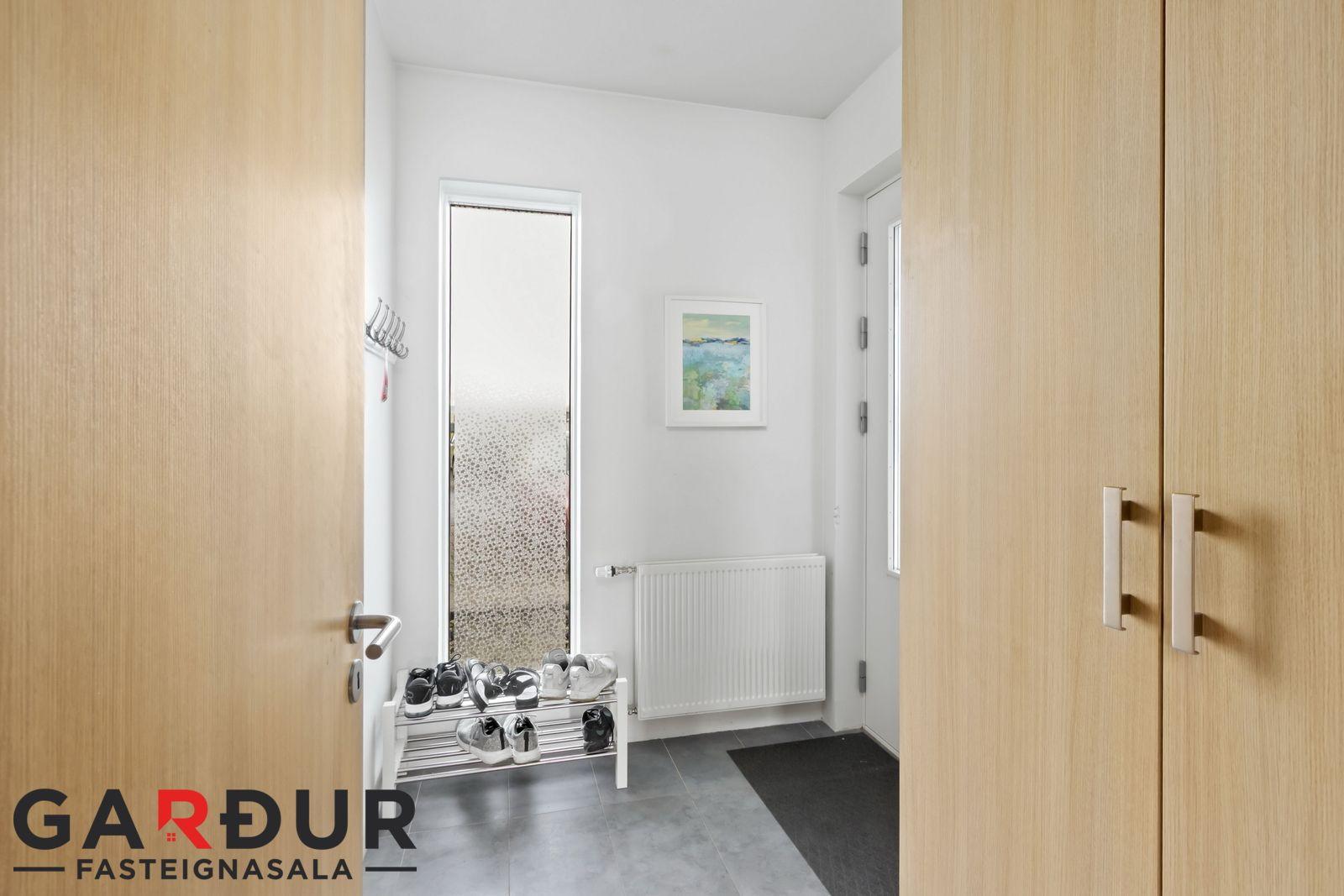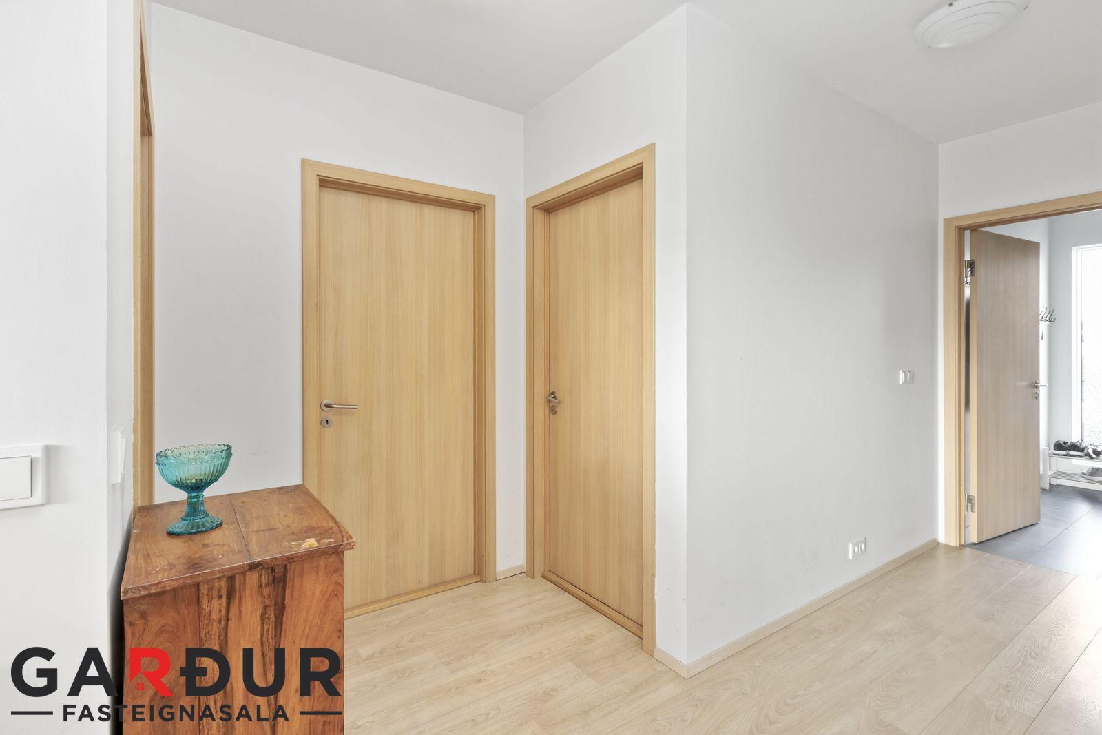 Nánari lýsing: Forstofa með fataskáp, flísar á gólfi. Stofa og eldhús eru í opnu alrými með gluggum til suðurs, parket á gólfi og útgengt á sérverönd til suðurs. Möguleiki er á að byggja sólpall. Eldhús, vönduð innrétting með eikaráferð frá Axis, gott vinnupláss og tengi fyrir uppþvottavél, parket á gólfi. Svefnherbergi I með fataskáp, parket á gólfi. Svefnherbergi II með fataskáp, parket á gólfi. Geymsla / svefnherbergi III með glugga og er innan íbúðar, er geymsla á teikningu en notað sem svefnherbergi í dag, parket á gólfi. Baðherbergi, flísalagt með innréttingu og góðum skápum, sturtu og upphengdu salerni. Þvottahús, flísalagt með borðplötu, skolvask, geymslu hillum og aðstöðu fyrir þvottavél og þurrkara.