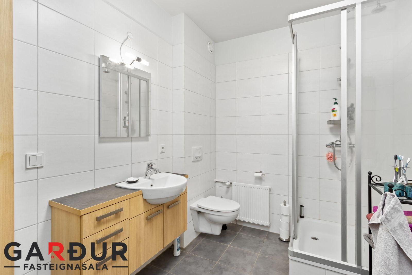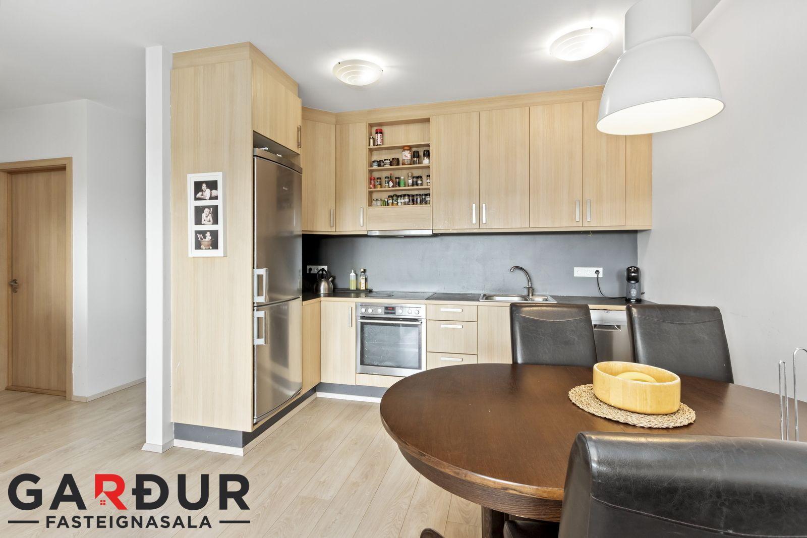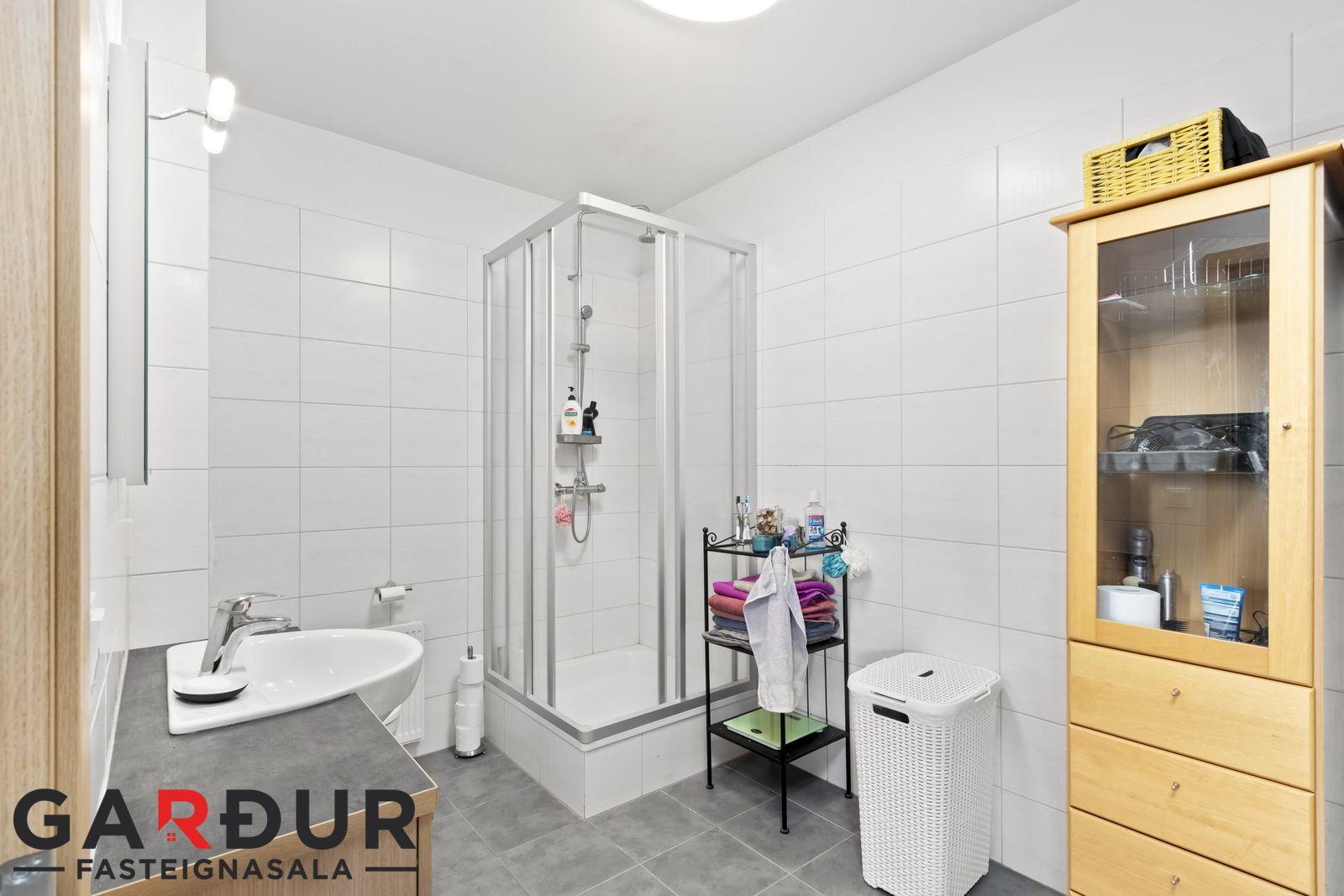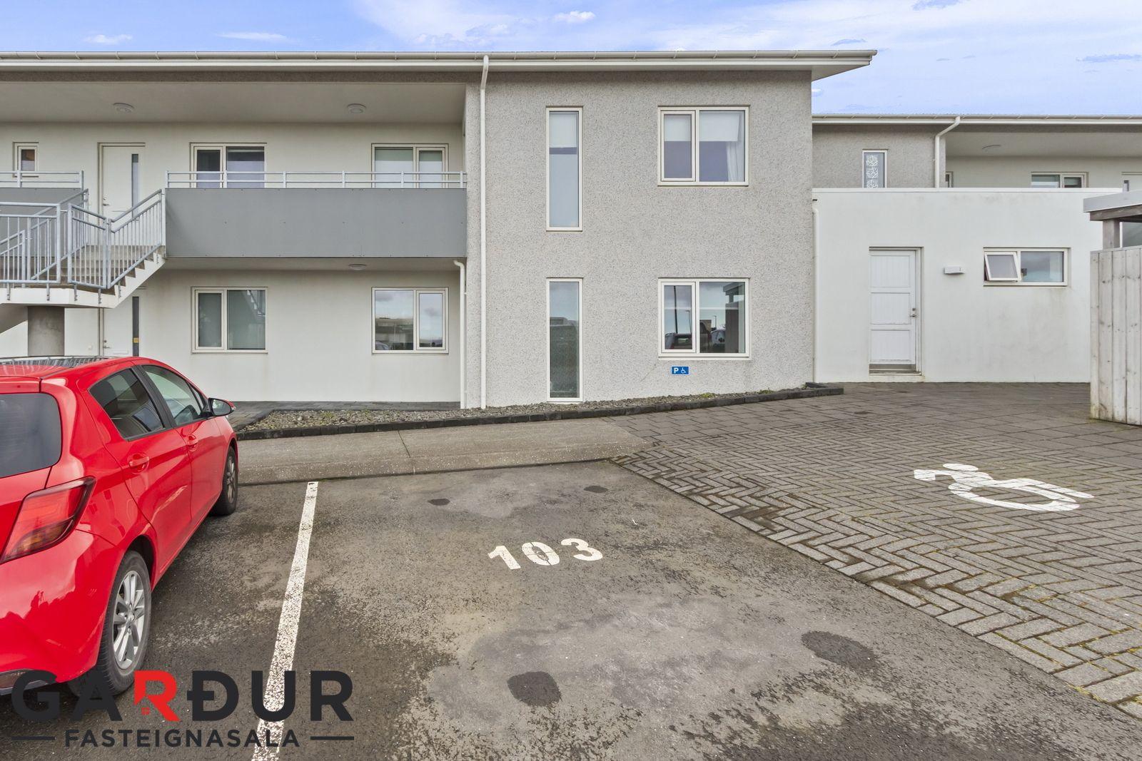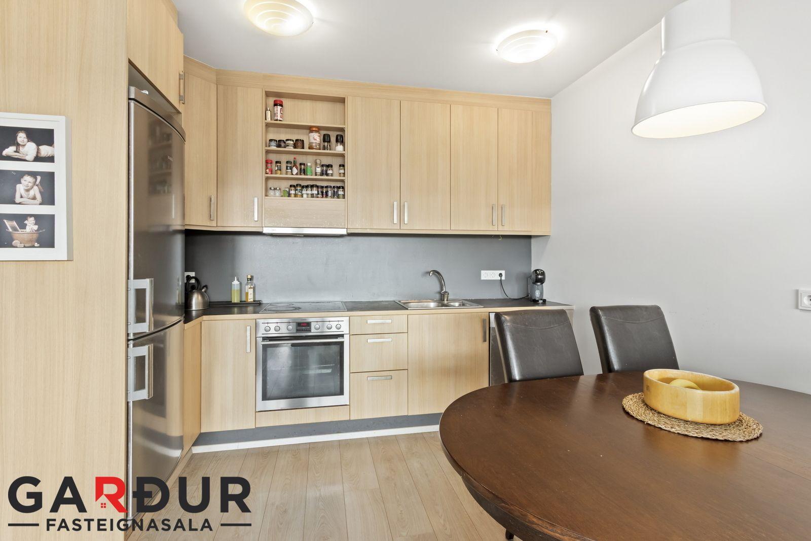 Nánari lýsing: Forstofa með fataskáp, flísar á gólfi. Stofa og eldhús eru í opnu alrými með gluggum til suðurs, parket á gólfi og útgengt á sérverönd til suðurs. Möguleiki er á að byggja sólpall. Eldhús, vönduð innrétting með eikaráferð frá Axis, gott vinnupláss og tengi fyrir uppþvottavél, parket á gólfi. Svefnherbergi I með fataskáp, parket á gólfi. Svefnherbergi II með fataskáp, parket á gólfi. Geymsla / svefnherbergi III með glugga og er innan íbúðar, er geymsla á teikningu en notað sem svefnherbergi í dag, parket á gólfi. Baðherbergi, flísalagt með innréttingu og góðum skápum, sturtu og upphengdu salerni. Þvottahús, flísalagt með borðplötu, skolvask, geymslu hillum og aðstöðu fyrir þvottavél og þurrkara.